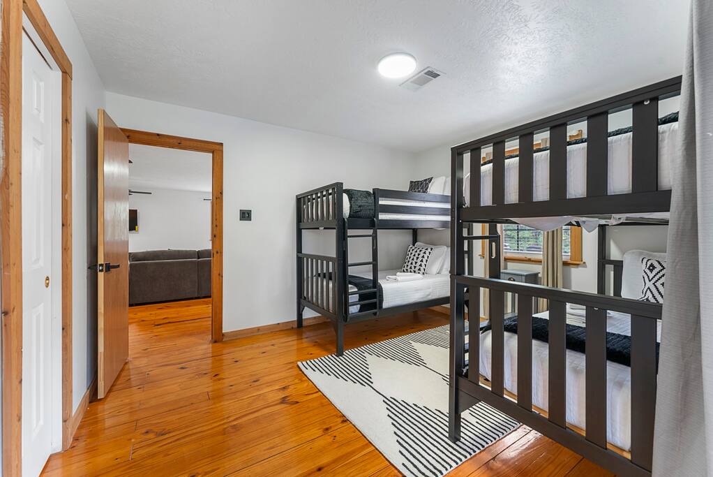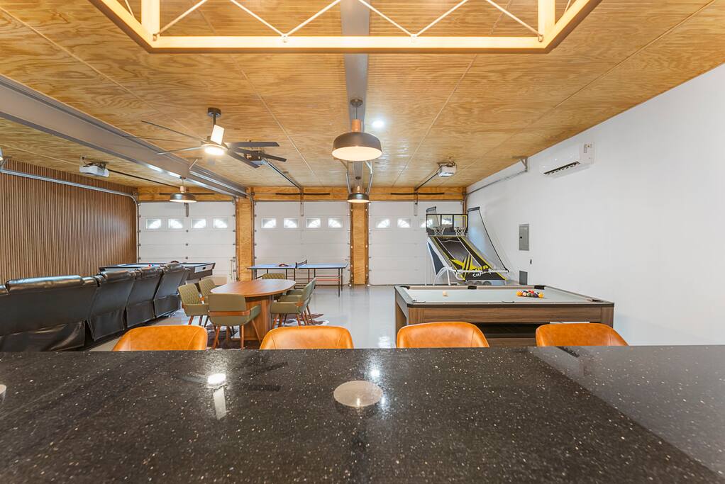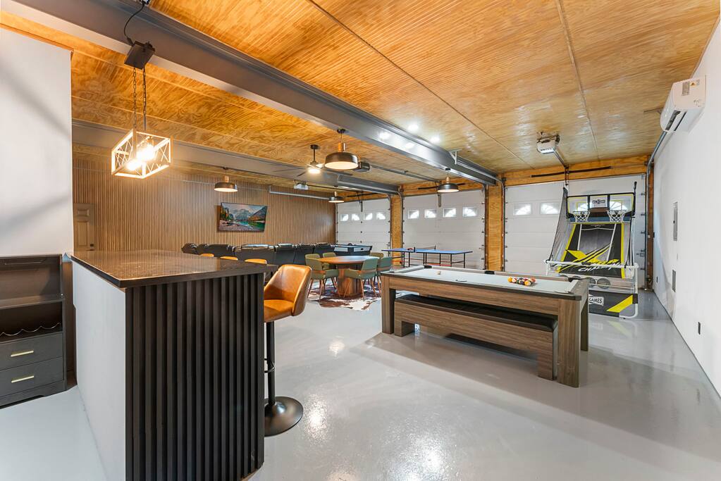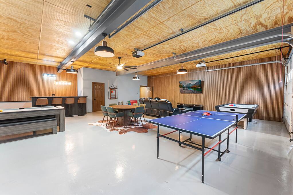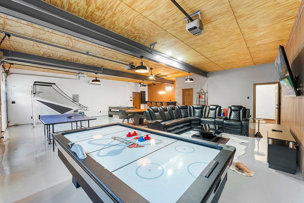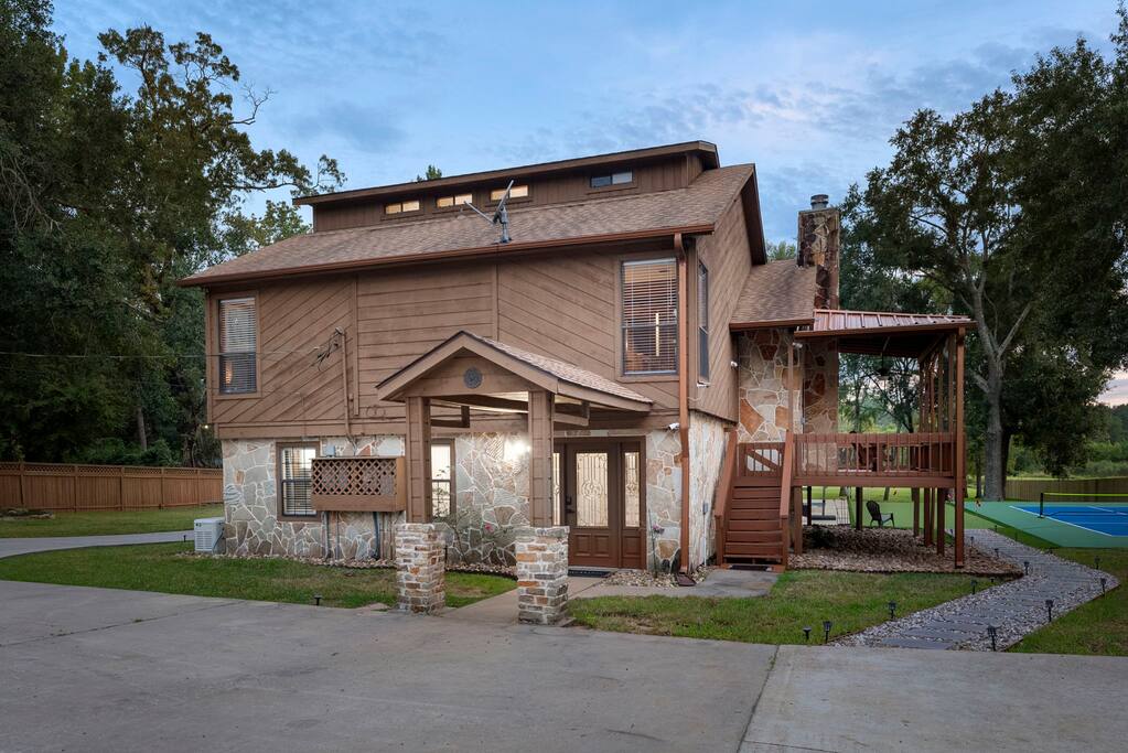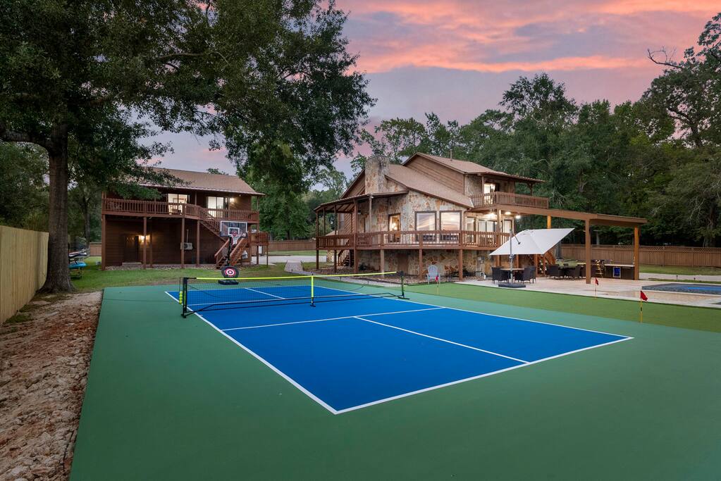 LIST OF AMENITIES - giant sparkling pool/spa - private pickleball court/multi-sport court - 4 hole mini-golf - 2 soccer nets - enclosed trampoline - kids playground - paddleboards (x2) - Gameroom: air hockey, billiards, ping-pong, game table, basketball game, bar area, media couch + big screen TV, and more! - Smart TV's throughout - inside separate gaming area adjacent to main living room in main house with play-station ...AND SO MUCH MORE! SPACES This modernized cabin-style home is really two homes on one property. The main house has 3 bedrooms (bunkroom-no stairs required, queen bedroom- 2nd floor, and primary King bedroom-3rd floor) with full kitchen, living room, 2nd living room, and 3 full bathrooms. The 2nd home is 25 feet from main house and has the converted 3 car RV garage game room with upstairs 2nd-level kitchen, living room, 2 bedrooms (bunk room with 2 bunk-beds and queen bedroom) with one full bathroom. Each house has plenty of deck-space with views of the lake. Both homes do have several stairs to reach bedrooms and main living spaces are on 2nd floors. There is plenty of space to park several cars (10 very comfortably). IMPORTANT NOTES: **There is an elevator in the main house that can reach the 2nd floor with queen bed. If you have elderly or those that need assistance or require the use of the elevator, please let us know as we will provide a separate key with code to access it. **While this home does have some fencing, please note there is NO fencing around the pool or preventing children from falling into the lake so please prepare accordingly. You release the owner and property manager from any liability for the use of the property and understand water risks of being lakefront and with a pool.