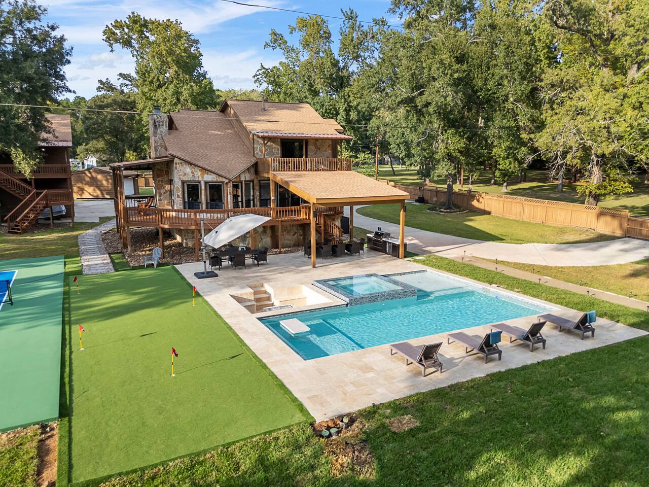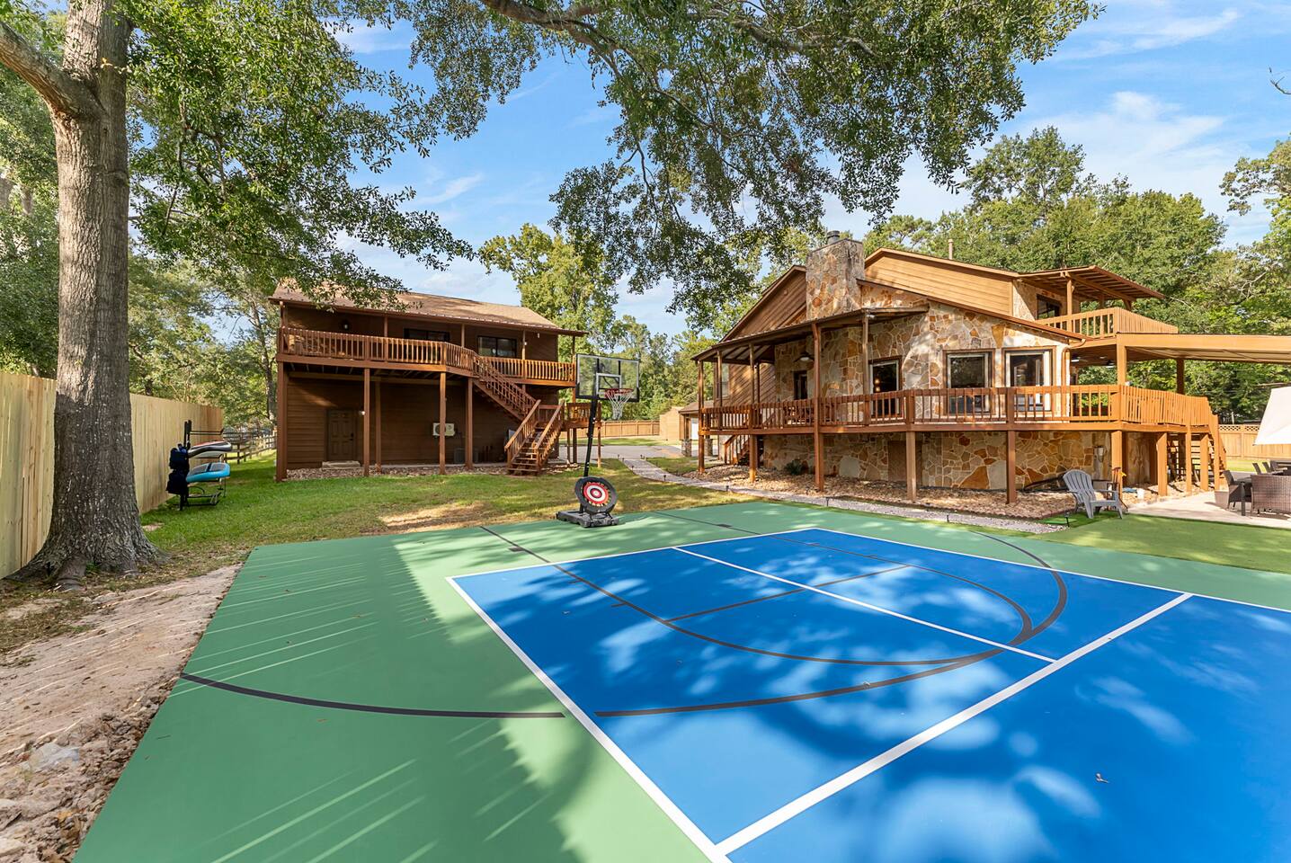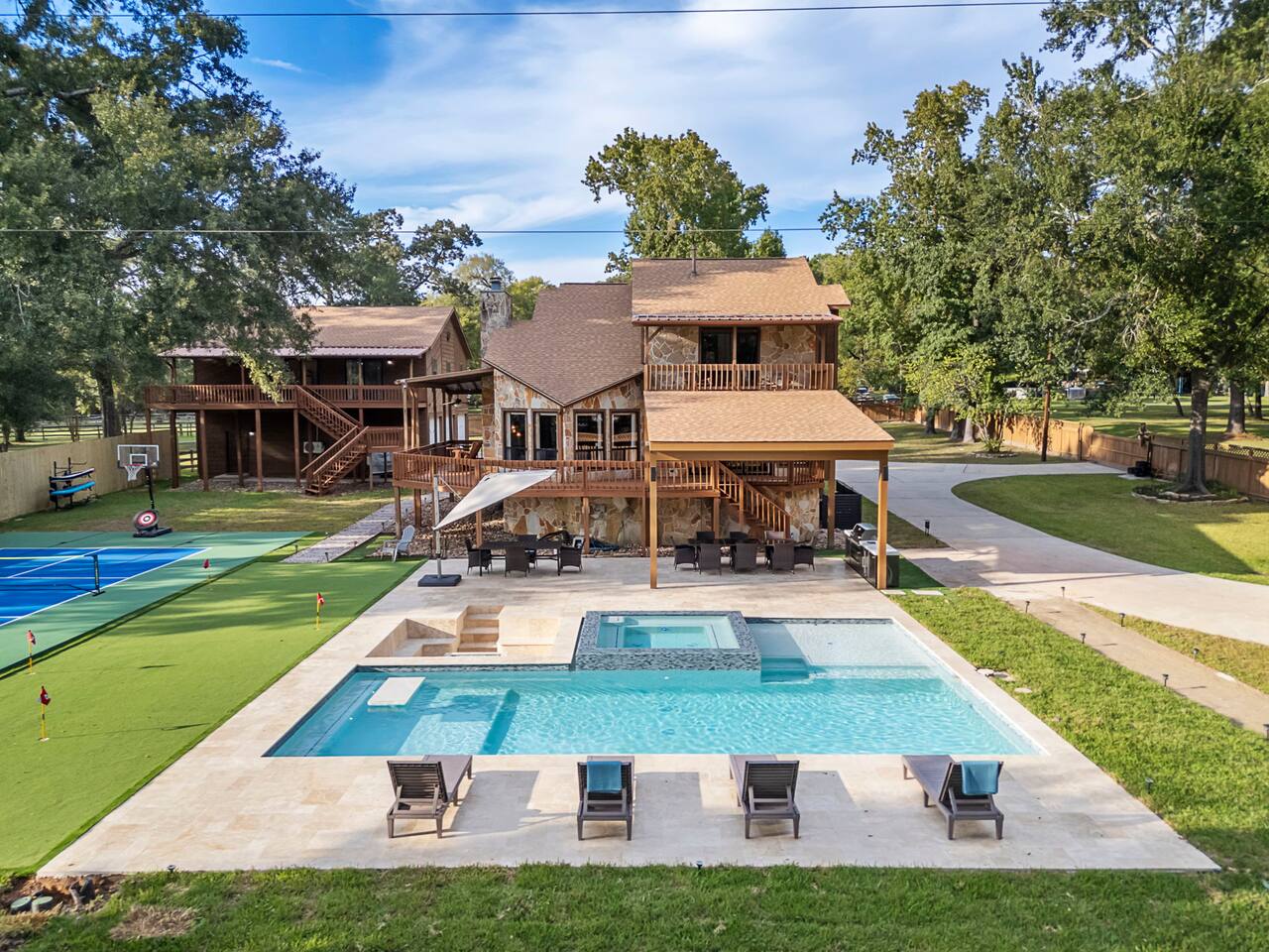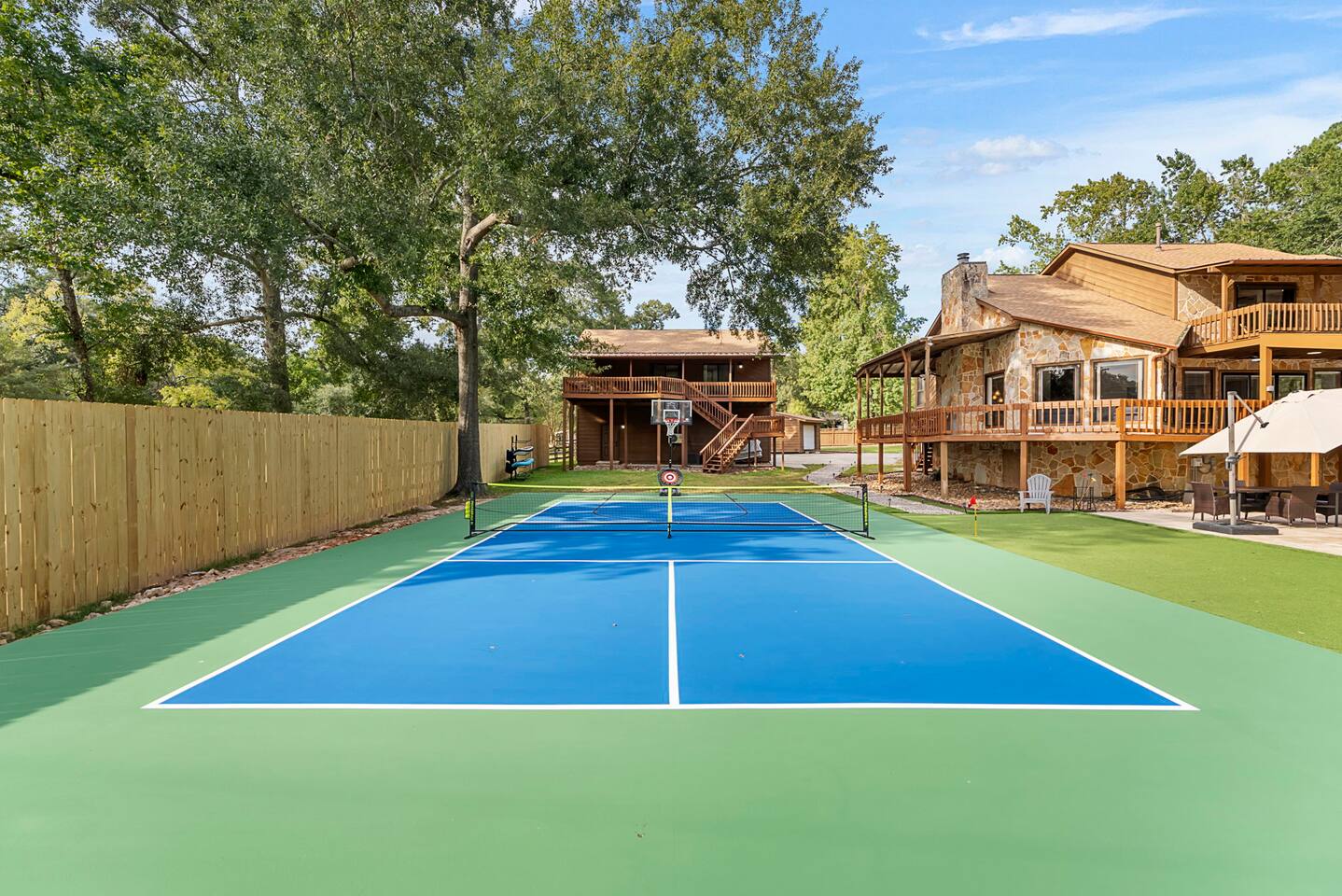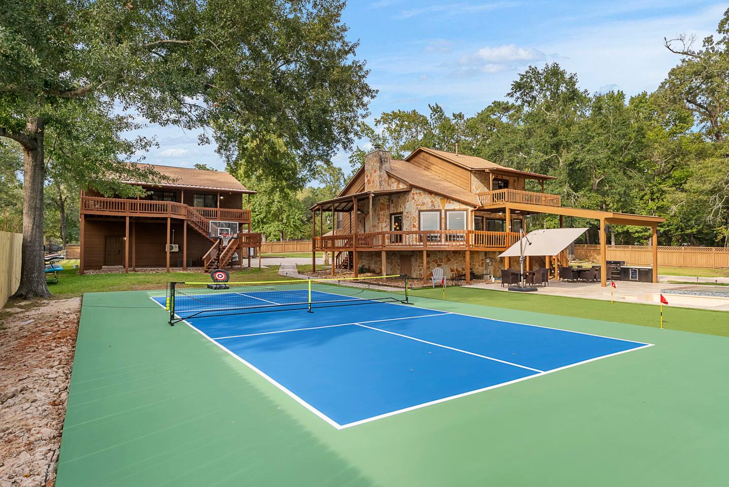 LIST OF AMENITIES - giant sparkling pool/spa - private pickleball court/multi-sport court - 4 hole mini-golf - 2 soccer nets - enclosed trampoline - kids playground - paddleboards (x2) - Gameroom: air hockey, billiards, ping-pong, game table, basketball game, bar area, media couch + big screen TV, and more! - Smart TV's throughout - inside separate gaming area adjacent to main living room in main house with play-station ...AND SO MUCH MORE! SLEEPING • MAIN HOUSE - 1st floor bedrooms: bunk room (2 FULL beds – 4 total people) full bathroom next to bedroom - 2nd floor bedroom: queen bed (elevator accessible), full bathroom next to bedroom - 3rd floor bedroom: King bed, primary suite (requires stairs to access), ensuite bathroom • 2ND HOME - 2nd floor bedroom: Queen bed - 2nd floor bedroom: bunk beds (4 twin beds), Full bathroom in main living area available - Blow up queen mattress in living room SPACES This modernized cabin-style home is really two homes on one property. The main house has 3 bedrooms (bunkroom-no stairs required, queen bedroom- 2nd floor, and primary King bedroom-3rd floor) with full kitchen, living room, 2nd living room, and 3 full bathrooms. The 2nd home is 25 feet from main house and has the converted 3 car RV garage game room with upstairs 2nd-level kitchen, living room, 2 bedrooms (bunk room with 2 bunk-beds and queen bedroom) with one full bathroom. Each house has plenty of deck-space with views of the lake. Both homes do have several stairs to reach bedrooms and main living spaces are on 2nd floors. There is plenty of space to park several cars (10 very comfortably). *IMPORTANT* LAKE ACCESS: a boat rental service company can be arranged after the booking however they will not deliver to the home itself. The drop off/pickup for the boat rental will be arranged offsite. If you have a boat, you are welcome to bring it and there is a public boat ramp about 5 min away to access the lake. Please note that the waters can be shallow around the property and it may be difficult to access with your boat. We do have 2 covered boat slips on-site if desired. There are some hazards north of 1097 bridge so please do your research so you understand the risks associated with parking your boat at the property. ELEVATOR: There is an elevator in the main house that can reach the 2nd floor with queen bed. If you have elderly or those that need assistance or require the use of the elevator, please let us know as we will provide a separate key with code to access it. WATER SAFETY: While this home does have some fencing, please note there is NO fencing around the pool or preventing children from falling into the lake so please prepare accordingly. You release the owner and property manager from any liability for the use of the property and understand water risks of being lakefront and with a pool.