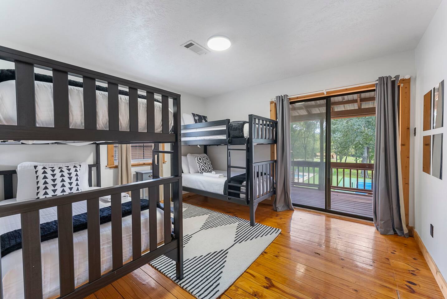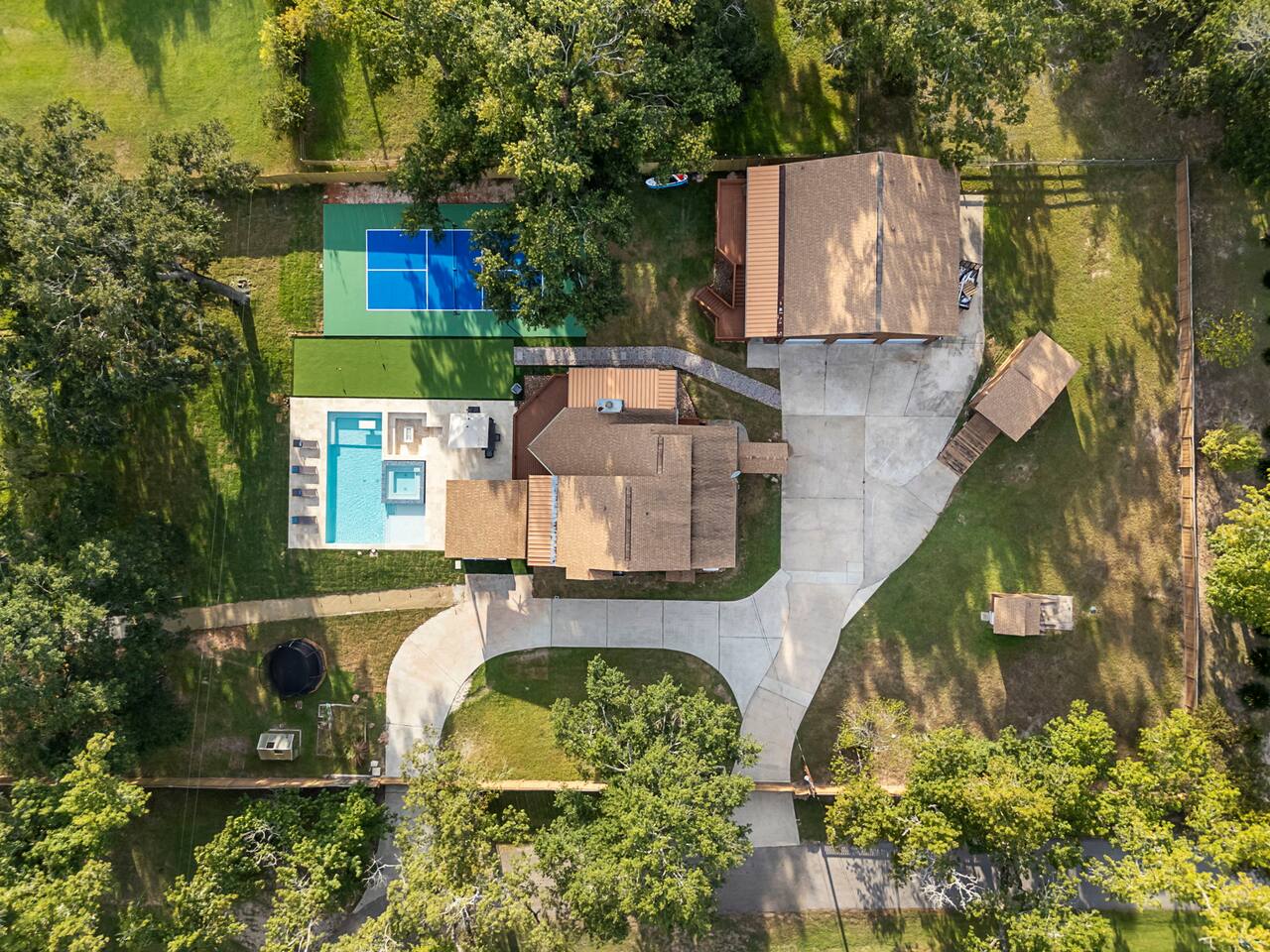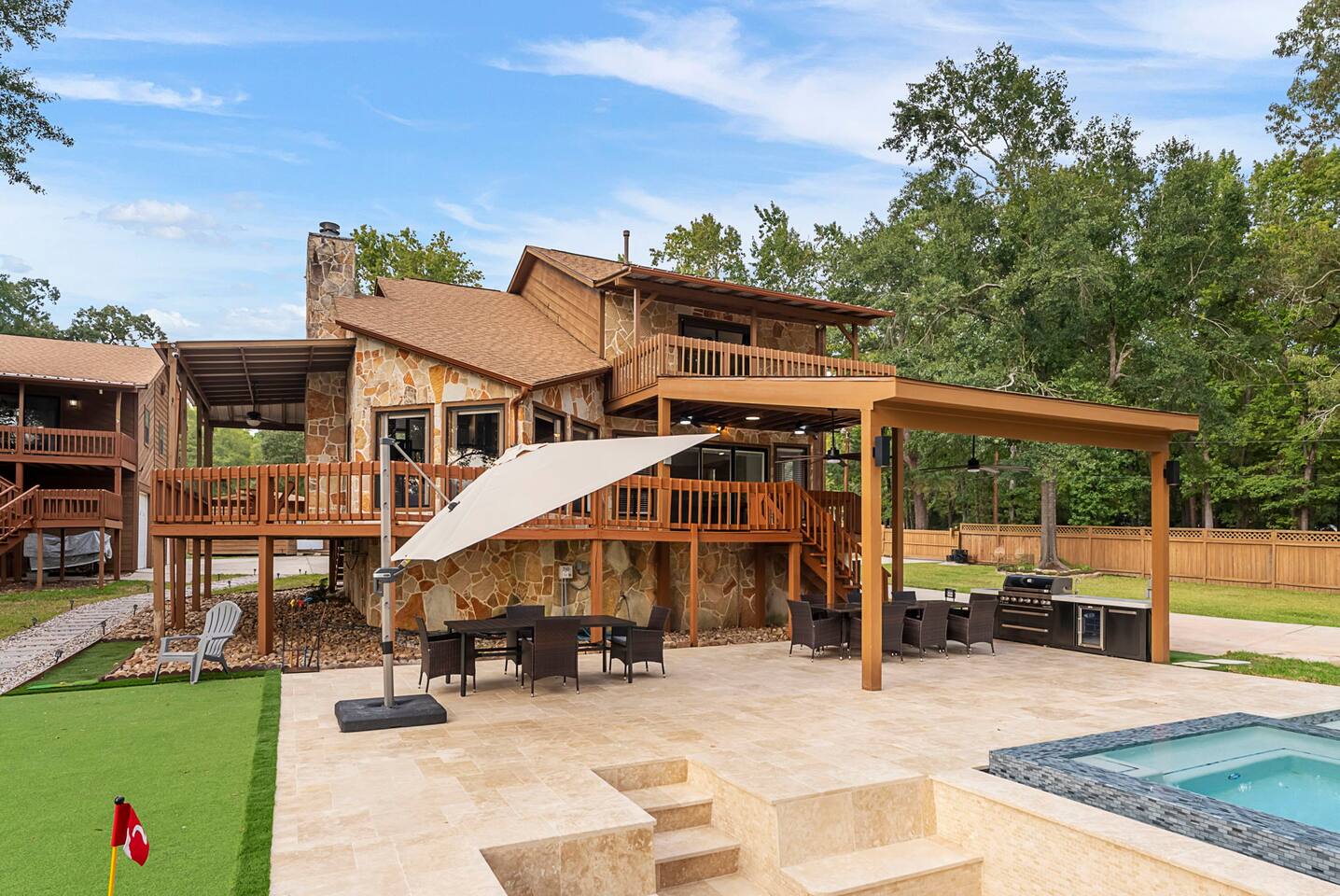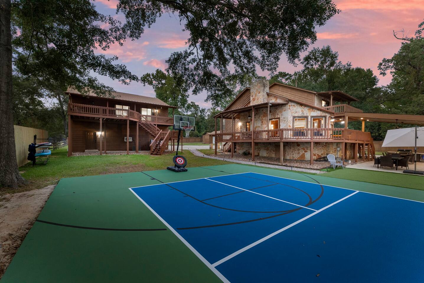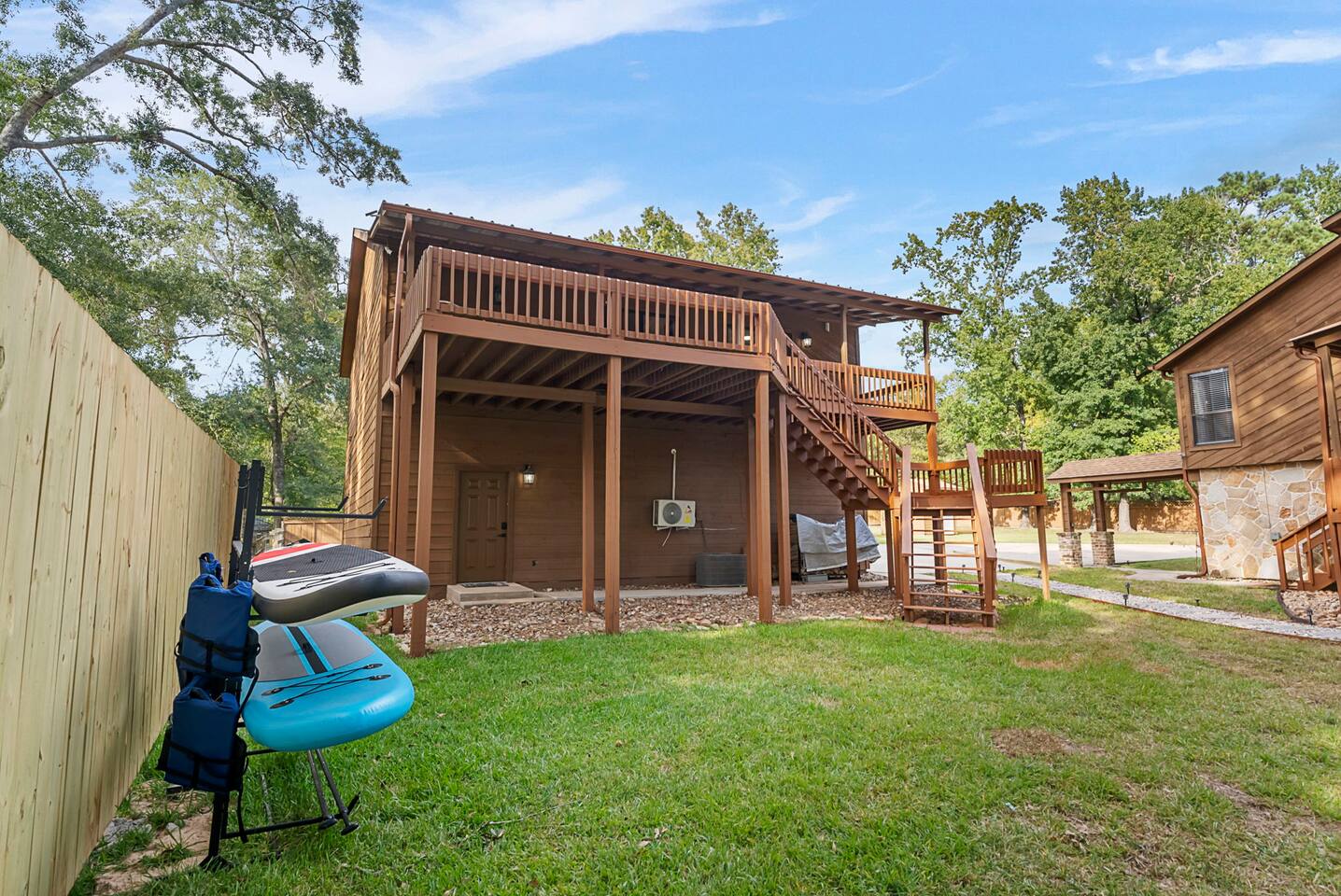 LIST OF AMENITIES - giant sparkling pool/spa - private pickleball court/multi-sport court - 4 hole mini-golf - 2 soccer nets - enclosed trampoline - kids playground - paddleboards (x2) - Gameroom: air hockey, billiards, ping-pong, game table, basketball game, bar area, media couch + big screen TV, and more! - Smart TV's throughout - inside separate gaming area adjacent to main living room in main house with play-station ...AND SO MUCH MORE! SLEEPING • MAIN HOUSE - 1st floor bedrooms: bunk room (2 FULL beds – 4 total people) full bathroom next to bedroom - 2nd floor bedroom: queen bed (elevator accessible), full bathroom next to bedroom - 3rd floor bedroom: King bed, primary suite (requires stairs to access), ensuite bathroom • 2ND HOME - 2nd floor bedroom: Queen bed - 2nd floor bedroom: bunk beds (4 twin beds), Full bathroom in main living area available - Blow up queen mattress in living room SPACES This modernized cabin-style home is really two homes on one property. The main house has 3 bedrooms (bunkroom-no stairs required, queen bedroom- 2nd floor, and primary King bedroom-3rd floor) with full kitchen, living room, 2nd living room, and 3 full bathrooms. The 2nd home is 25 feet from main house and has the converted 3 car RV garage game room with upstairs 2nd-level kitchen, living room, 2 bedrooms (bunk room with 2 bunk-beds and queen bedroom) with one full bathroom. Each house has plenty of deck-space with views of the lake. Both homes do have several stairs to reach bedrooms and main living spaces are on 2nd floors. There is plenty of space to park several cars (10 very comfortably). *IMPORTANT* LAKE ACCESS: a boat rental service company can be arranged after the booking however they will not deliver to the home itself. The drop off/pickup for the boat rental will be arranged offsite. If you have a boat, you are welcome to bring it and there is a public boat ramp about 5 min away to access the lake. Please note that the waters can be shallow around the property and it may be difficult to access with your boat. We do have 2 covered boat slips on-site if desired. There are some hazards north of 1097 bridge so please do your research so you understand the risks associated with parking your boat at the property. ELEVATOR: There is an elevator in the main house that can reach the 2nd floor with queen bed. If you have elderly or those that need assistance or require the use of the elevator, please let us know as we will provide a separate key with code to access it. WATER SAFETY: While this home does have some fencing, please note there is NO fencing around the pool or preventing children from falling into the lake so please prepare accordingly. You release the owner and property manager from any liability for the use of the property and understand water risks of being lakefront and with a pool.