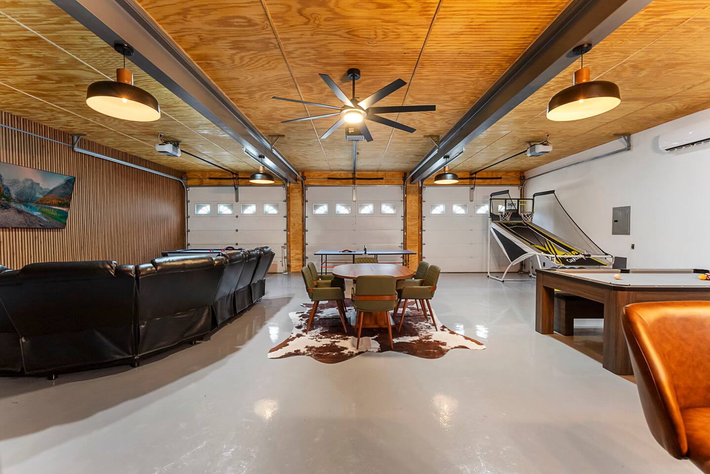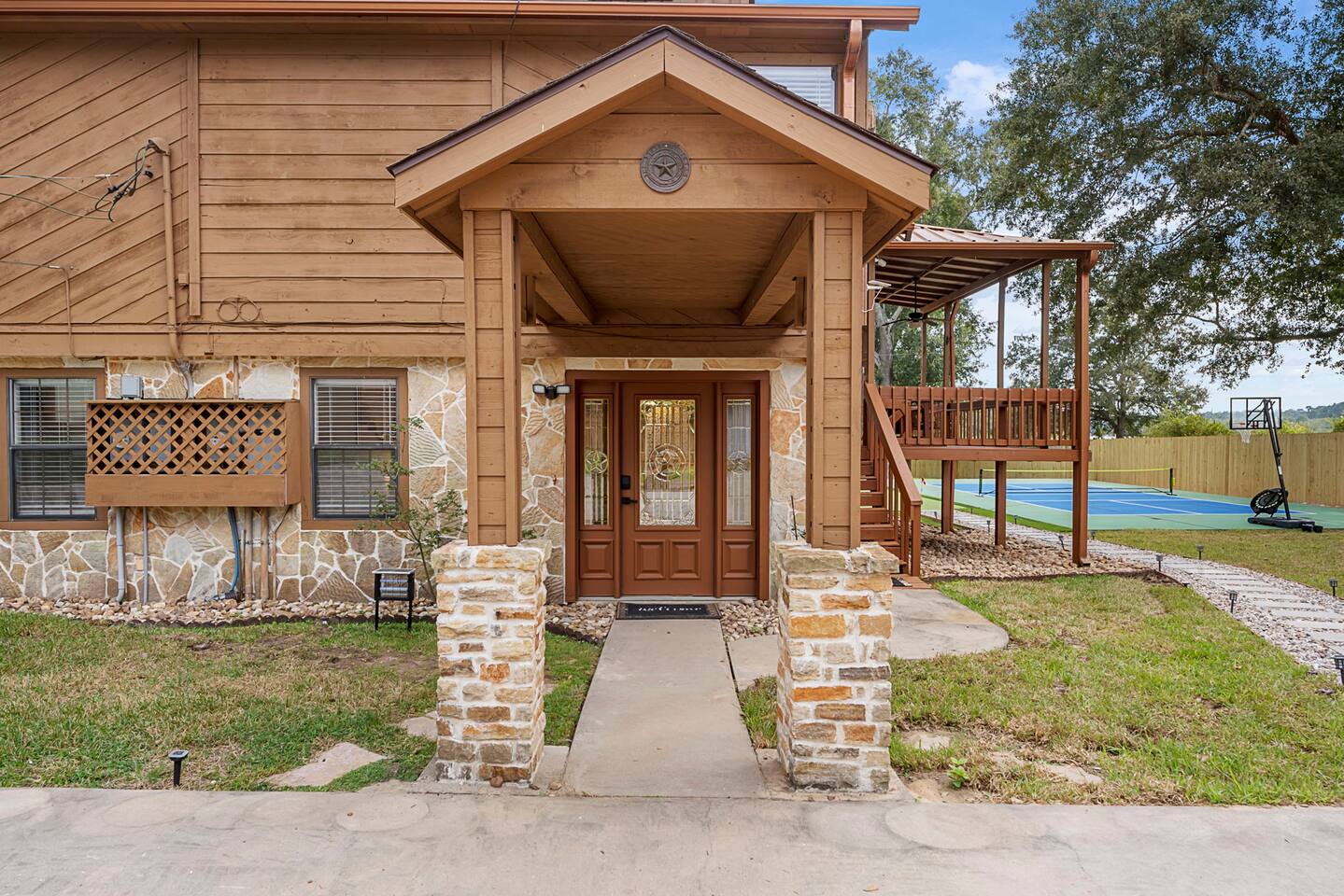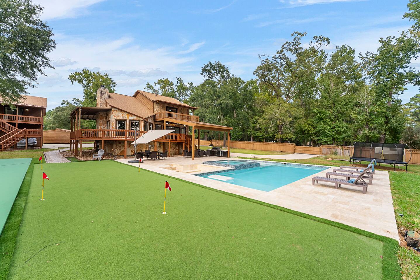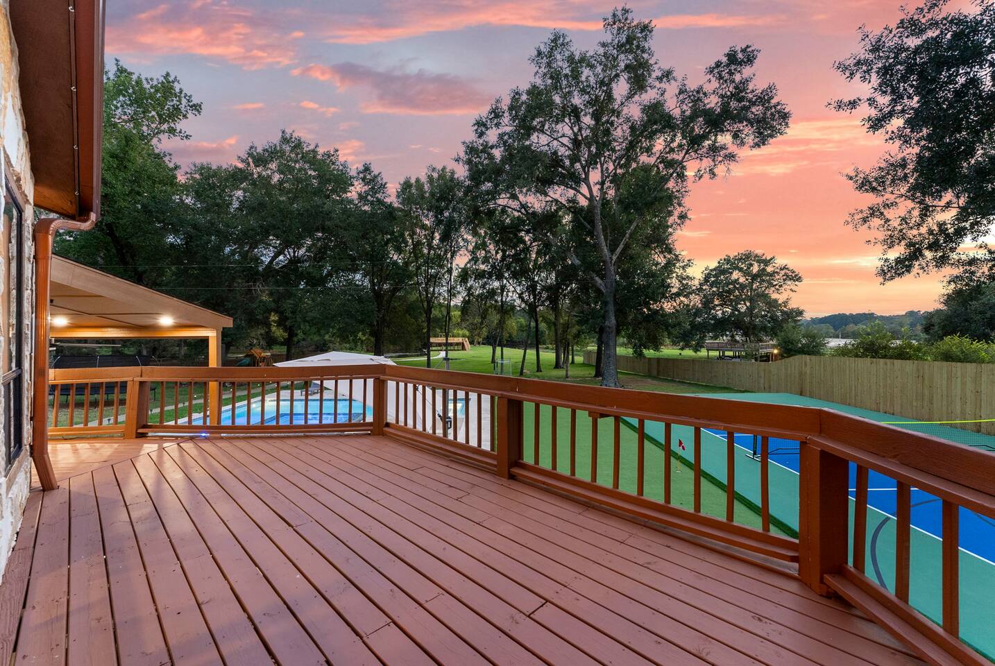 LIST OF AMENITIES - giant sparkling pool/spa - private pickleball court/multi-sport court - 4 hole mini-golf - 2 soccer nets - enclosed trampoline - kids playground - paddleboards (x2) - Gameroom: air hockey, billiards, ping-pong, game table, basketball game, bar area, media couch + big screen TV, and more! - Smart TV's throughout - inside separate gaming area adjacent to main living room in main house with play-station ...AND SO MUCH MORE! SLEEPING • MAIN HOUSE - 1st floor bedrooms: bunk room (2 FULL beds – 4 total people) full bathroom next to bedroom - 2nd floor bedroom: queen bed (elevator accessible), full bathroom next to bedroom - 3rd floor bedroom: King bed, primary suite (requires stairs to access), ensuite bathroom • 2ND HOME - 2nd floor bedroom: Queen bed - 2nd floor bedroom: bunk beds (4 twin beds), Full bathroom in main living area available - Blow up queen mattress in living room SPACES This modernized cabin-style home is really two homes on one property. The main house has 3 bedrooms (bunkroom-no stairs required, queen bedroom- 2nd floor, and primary King bedroom-3rd floor) with full kitchen, living room, 2nd living room, and 3 full bathrooms. The 2nd home is 25 feet from main house and has the converted 3 car RV garage game room with upstairs 2nd-level kitchen, living room, 2 bedrooms (bunk room with 2 bunk-beds and queen bedroom) with one full bathroom. Each house has plenty of deck-space with views of the lake. Both homes do have several stairs to reach bedrooms and main living spaces are on 2nd floors. There is plenty of space to park several cars (10 very comfortably). *IMPORTANT* LAKE ACCESS: a boat rental service company can be arranged after the booking however they will not deliver to the home itself. The drop off/pickup for the boat rental will be arranged offsite. If you have a boat, you are welcome to bring it and there is a public boat ramp about 5 min away to access the lake. Please note that the waters can be shallow around the property and it may be difficult to access with your boat. We do have 2 covered boat slips on-site if desired. There are some hazards north of 1097 bridge so please do your research so you understand the risks associated with parking your boat at the property. ELEVATOR: There is an elevator in the main house that can reach the 2nd floor with queen bed. If you have elderly or those that need assistance or require the use of the elevator, please let us know as we will provide a separate key with code to access it. WATER SAFETY: While this home does have some fencing, please note there is NO fencing around the pool or preventing children from falling into the lake so please prepare accordingly. You release the owner and property manager from any liability for the use of the property and understand water risks of being lakefront and with a pool.