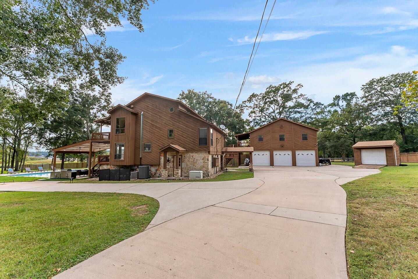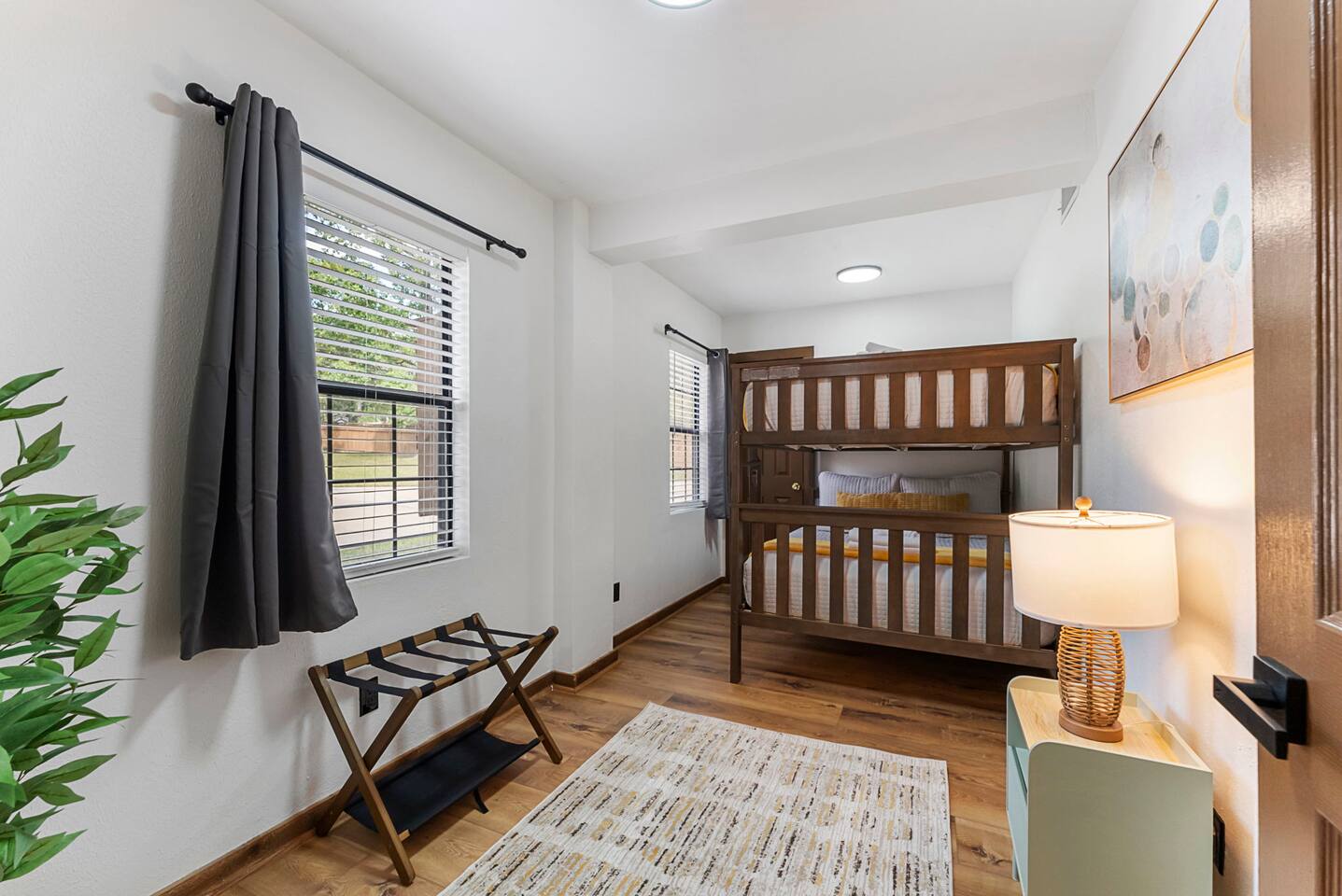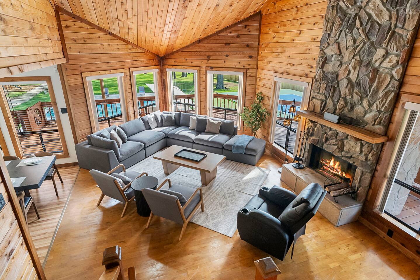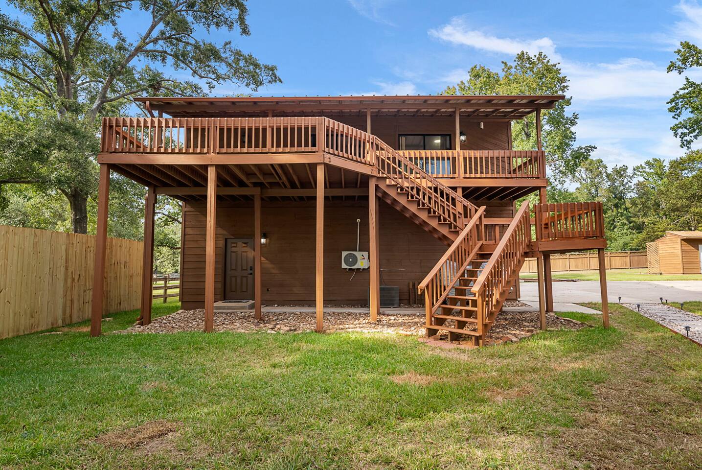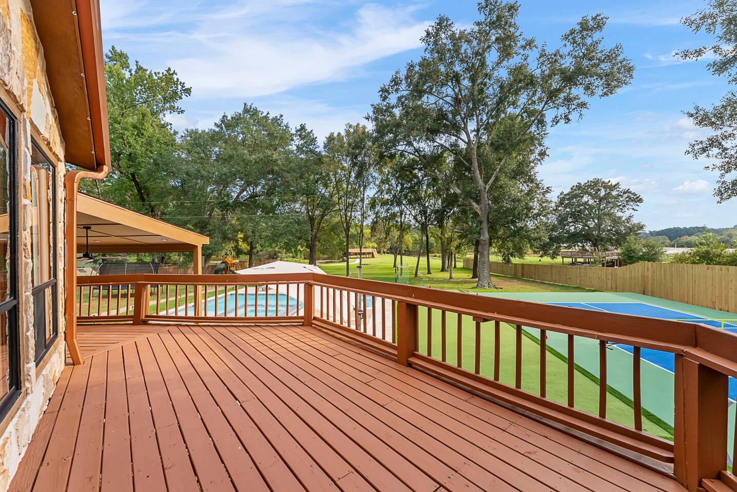 LIST OF AMENITIES - giant sparkling pool/spa - private pickleball court/multi-sport court - 4 hole mini-golf - 2 soccer nets - enclosed trampoline - kids playground - paddleboards (x2) - Gameroom: air hockey, billiards, ping-pong, game table, basketball game, bar area, media couch + big screen TV, and more! - Smart TV's throughout - inside separate gaming area adjacent to main living room in main house with play-station ...AND SO MUCH MORE! SLEEPING • MAIN HOUSE - 1st floor bedrooms: bunk room (2 FULL beds – 4 total people) full bathroom next to bedroom - 2nd floor bedroom: queen bed (elevator accessible), full bathroom next to bedroom - 3rd floor bedroom: King bed, primary suite (requires stairs to access), ensuite bathroom • 2ND HOME - 2nd floor bedroom: Queen bed - 2nd floor bedroom: bunk beds (4 twin beds), Full bathroom in main living area available - Blow up queen mattress in living room SPACES This modernized cabin-style home is really two homes on one property. The main house has 3 bedrooms (bunkroom-no stairs required, queen bedroom- 2nd floor, and primary King bedroom-3rd floor) with full kitchen, living room, 2nd living room, and 3 full bathrooms. The 2nd home is 25 feet from main house and has the converted 3 car RV garage game room with upstairs 2nd-level kitchen, living room, 2 bedrooms (bunk room with 2 bunk-beds and queen bedroom) with one full bathroom. Each house has plenty of deck-space with views of the lake. Both homes do have several stairs to reach bedrooms and main living spaces are on 2nd floors. There is plenty of space to park several cars (10 very comfortably). *IMPORTANT* LAKE ACCESS: a boat rental service company can be arranged after the booking however they will not deliver to the home itself. The drop off/pickup for the boat rental will be arranged offsite. If you have a boat, you are welcome to bring it and there is a public boat ramp about 5 min away to access the lake. Please note that the waters can be shallow around the property and it may be difficult to access with your boat. We do have 2 covered boat slips on-site if desired. There are some hazards north of 1097 bridge so please do your research so you understand the risks associated with parking your boat at the property. ELEVATOR: There is an elevator in the main house that can reach the 2nd floor with queen bed. If you have elderly or those that need assistance or require the use of the elevator, please let us know as we will provide a separate key with code to access it. WATER SAFETY: While this home does have some fencing, please note there is NO fencing around the pool or preventing children from falling into the lake so please prepare accordingly. You release the owner and property manager from any liability for the use of the property and understand water risks of being lakefront and with a pool.