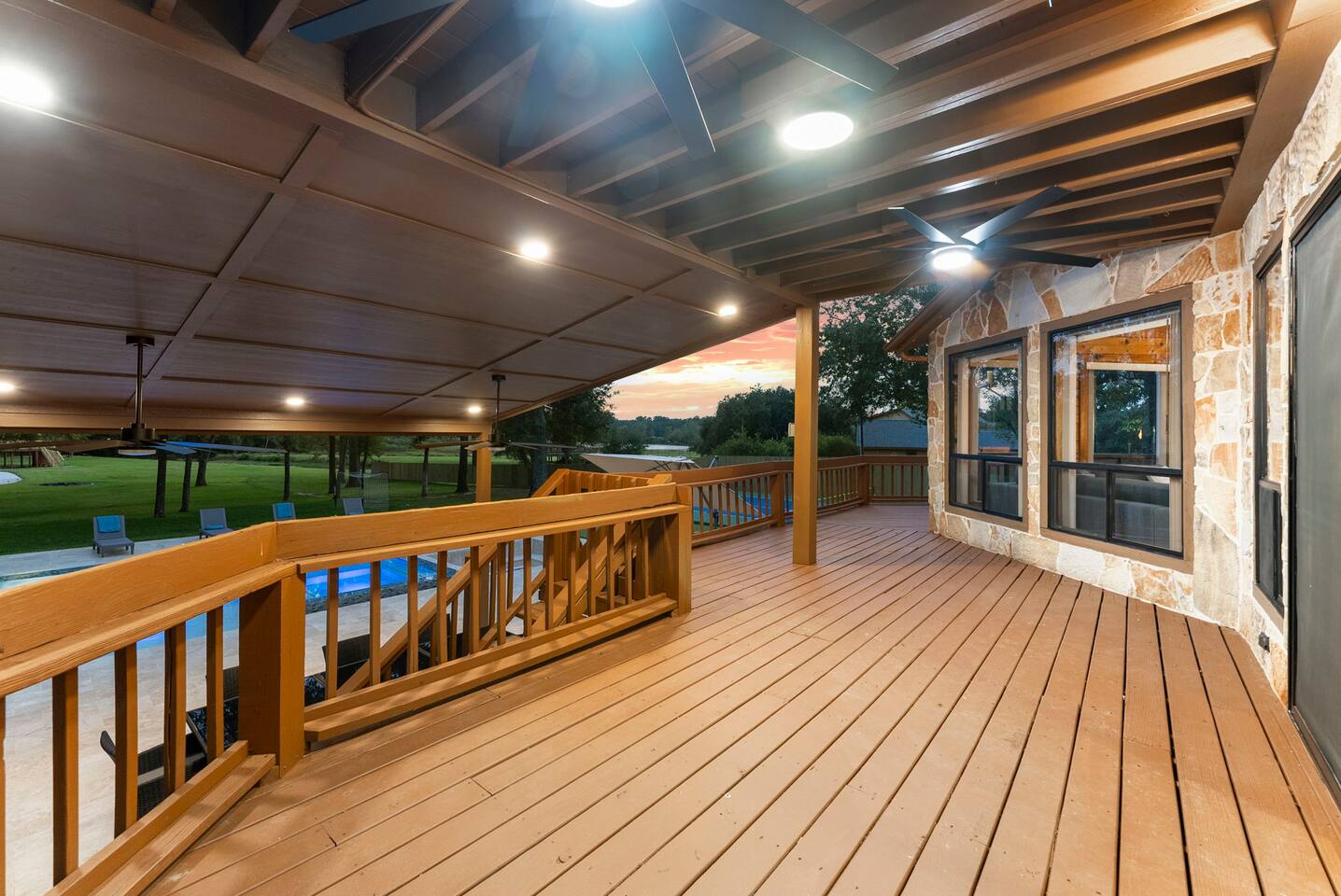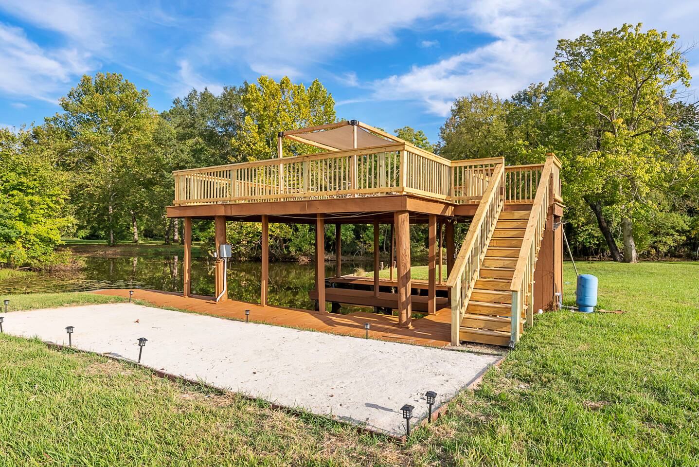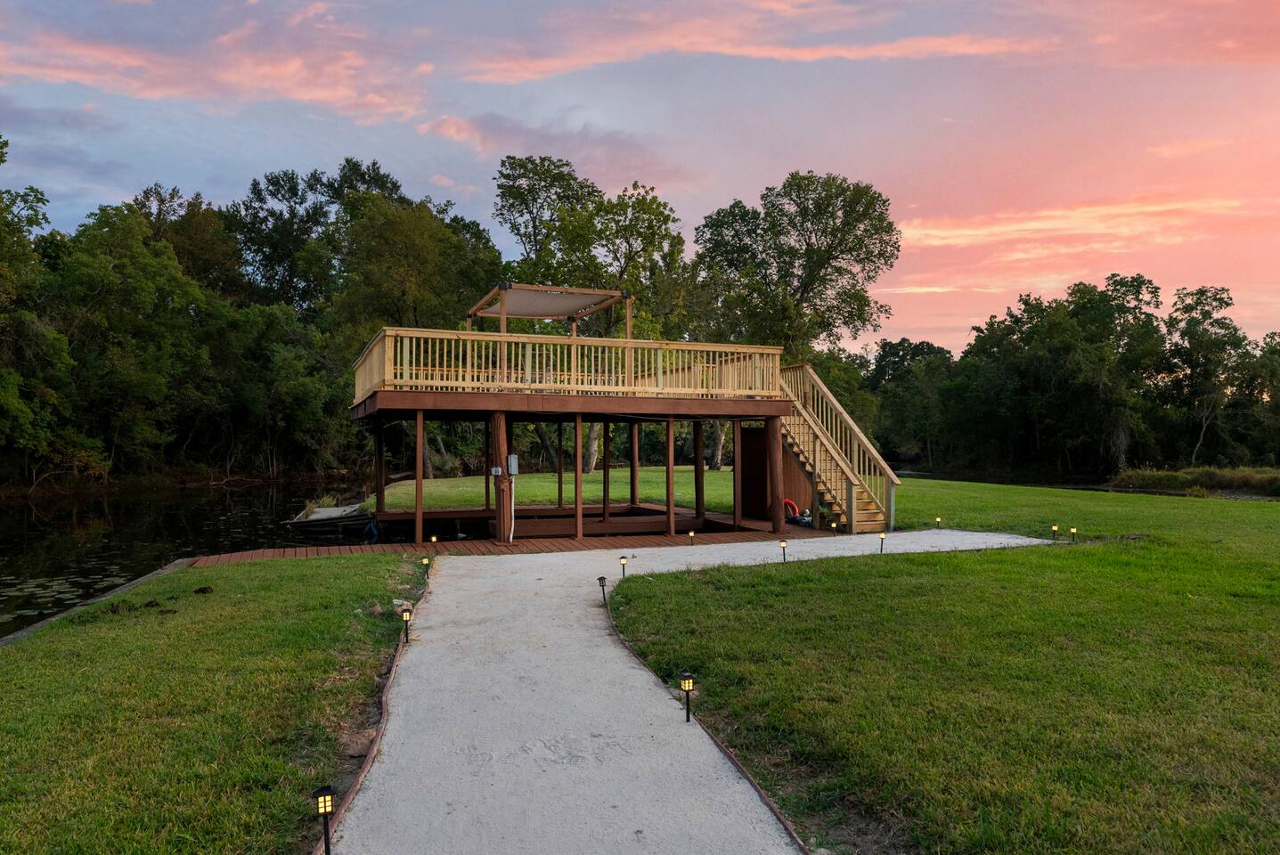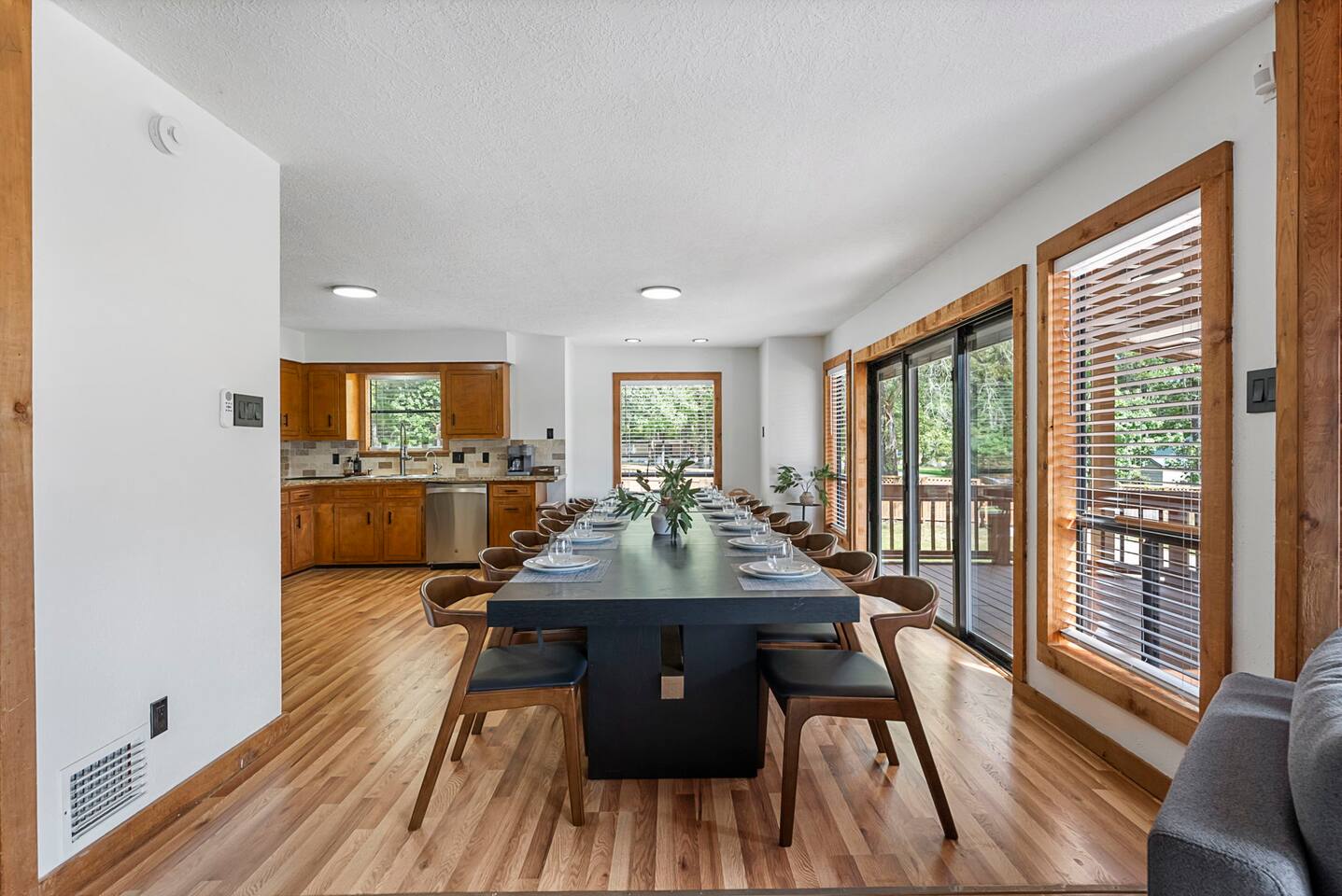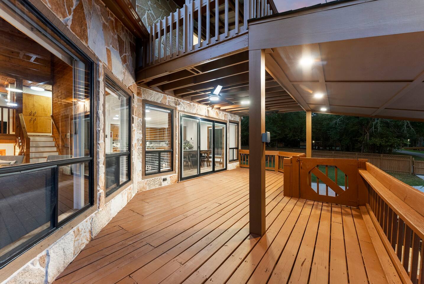 LIST OF AMENITIES - giant sparkling pool/spa - private pickleball court/multi-sport court - 4 hole mini-golf - 2 soccer nets - enclosed trampoline - kids playground - paddleboards (x2) - Gameroom: air hockey, billiards, ping-pong, game table, basketball game, bar area, media couch + big screen TV, and more! - Smart TV's throughout - inside separate gaming area adjacent to main living room in main house with play-station ...AND SO MUCH MORE! SLEEPING • MAIN HOUSE - 1st floor bedrooms: bunk room (2 FULL beds – 4 total people) full bathroom next to bedroom - 2nd floor bedroom: queen bed (elevator accessible), full bathroom next to bedroom - 3rd floor bedroom: King bed, primary suite (requires stairs to access), ensuite bathroom • 2ND HOME - 2nd floor bedroom: Queen bed - 2nd floor bedroom: bunk beds (4 twin beds), Full bathroom in main living area available - Blow up queen mattress in living room SPACES This modernized cabin-style home is really two homes on one property. The main house has 3 bedrooms (bunkroom-no stairs required, queen bedroom- 2nd floor, and primary King bedroom-3rd floor) with full kitchen, living room, 2nd living room, and 3 full bathrooms. The 2nd home is 25 feet from main house and has the converted 3 car RV garage game room with upstairs 2nd-level kitchen, living room, 2 bedrooms (bunk room with 2 bunk-beds and queen bedroom) with one full bathroom. Each house has plenty of deck-space with views of the lake. Both homes do have several stairs to reach bedrooms and main living spaces are on 2nd floors. There is plenty of space to park several cars (10 very comfortably). *IMPORTANT* LAKE ACCESS: a boat rental service company can be arranged after the booking however they will not deliver to the home itself. The drop off/pickup for the boat rental will be arranged offsite. If you have a boat, you are welcome to bring it and there is a public boat ramp about 5 min away to access the lake. Please note that the waters can be shallow around the property and it may be difficult to access with your boat. We do have 2 covered boat slips on-site if desired. There are some hazards north of 1097 bridge so please do your research so you understand the risks associated with parking your boat at the property. ELEVATOR: There is an elevator in the main house that can reach the 2nd floor with queen bed. If you have elderly or those that need assistance or require the use of the elevator, please let us know as we will provide a separate key with code to access it. WATER SAFETY: While this home does have some fencing, please note there is NO fencing around the pool or preventing children from falling into the lake so please prepare accordingly. You release the owner and property manager from any liability for the use of the property and understand water risks of being lakefront and with a pool.
