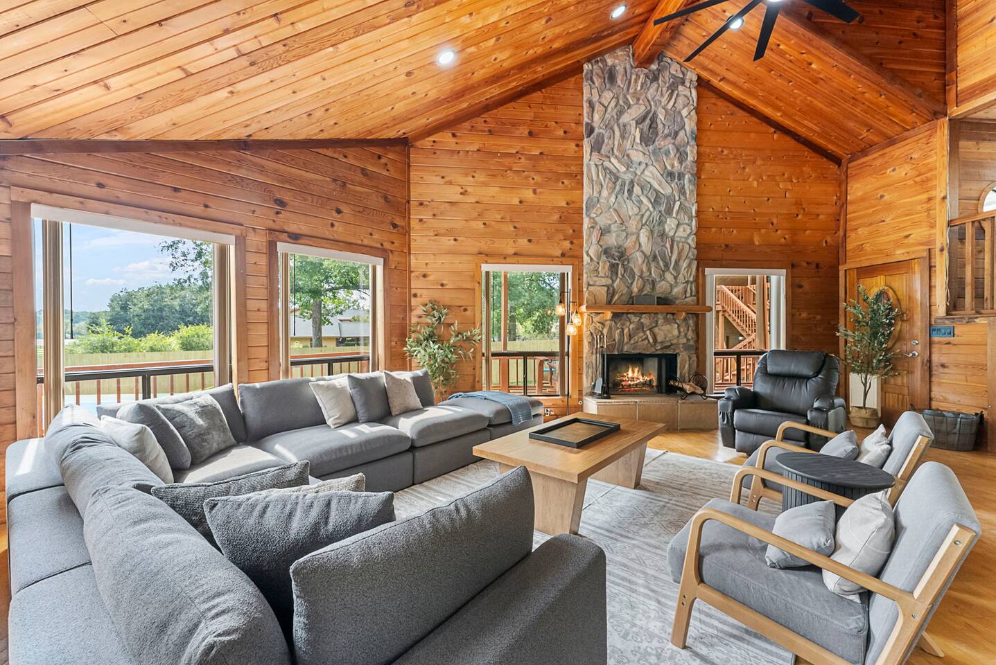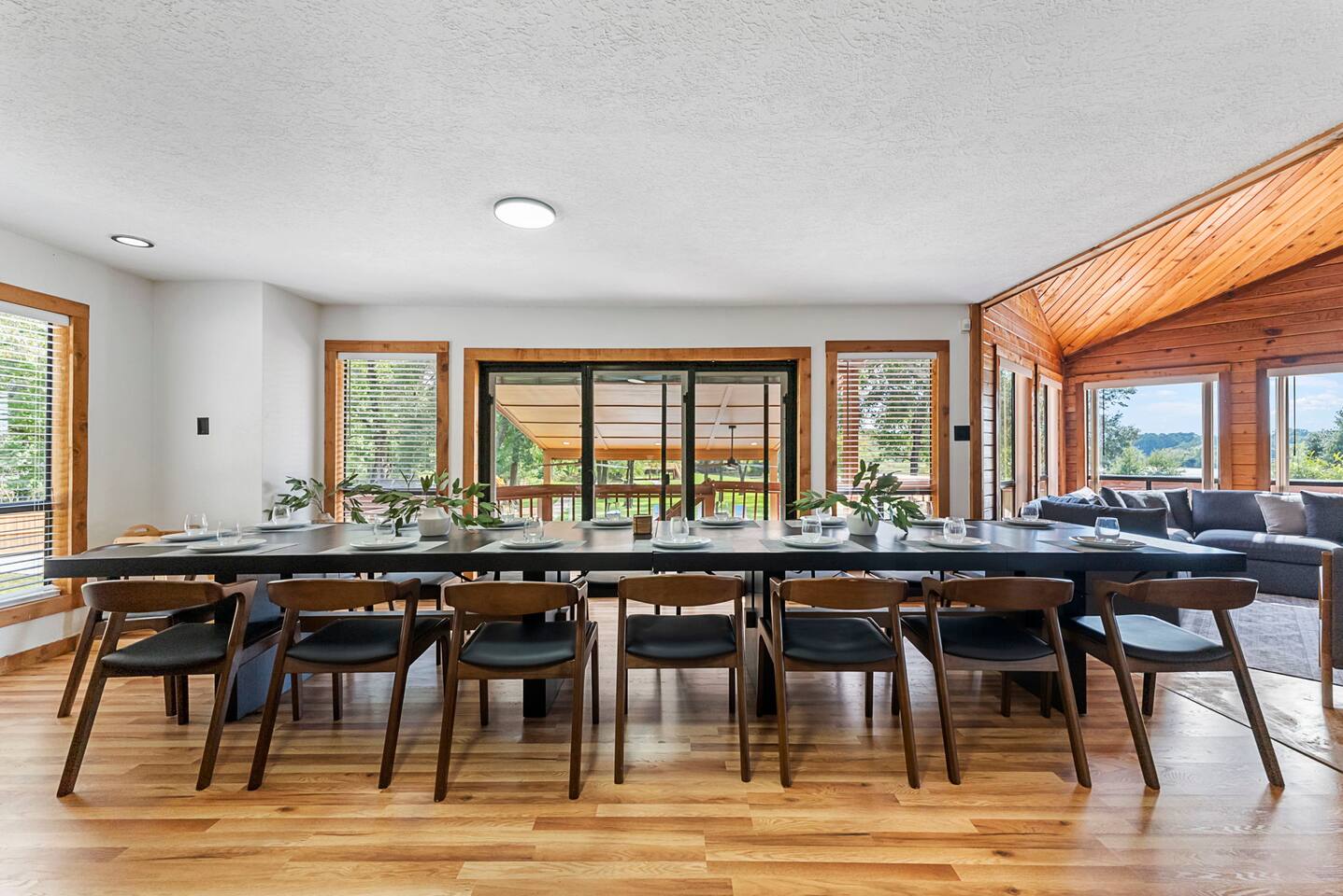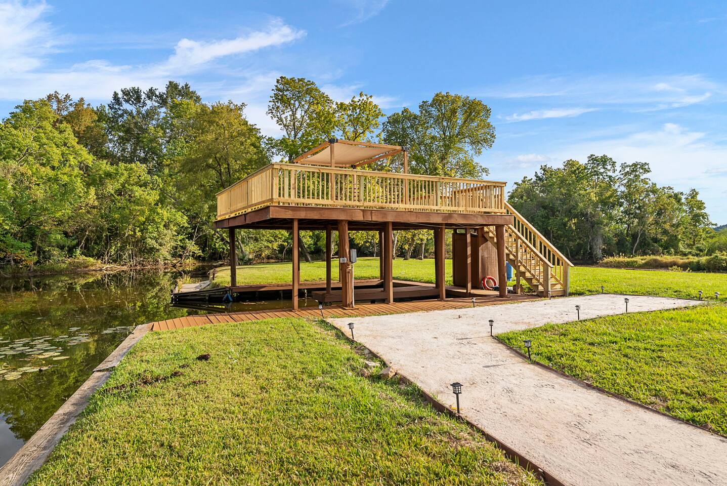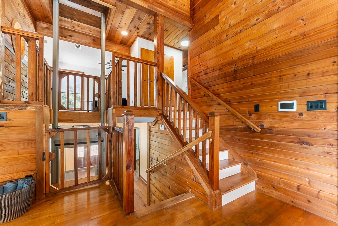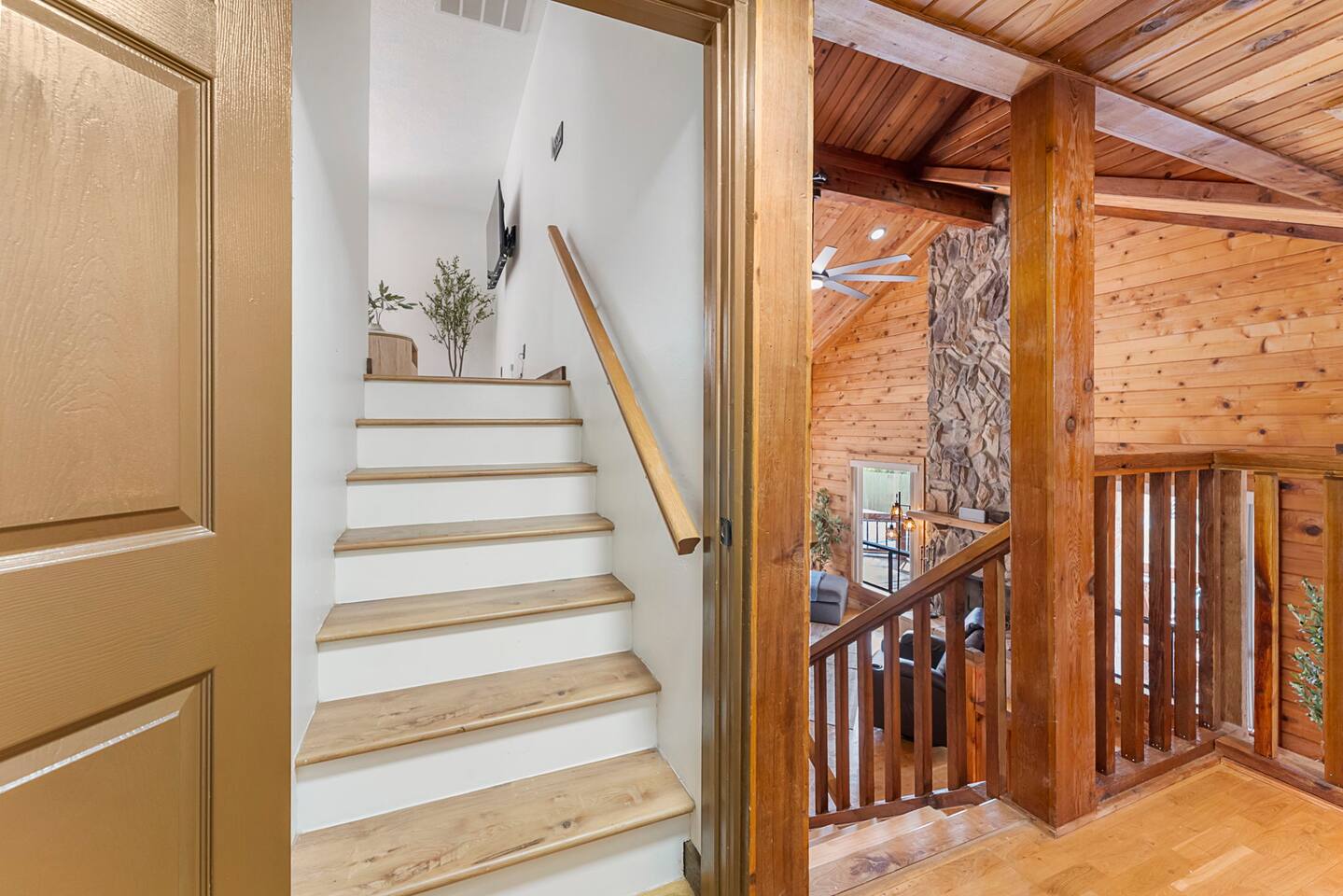 LIST OF AMENITIES - giant sparkling pool/spa - private pickleball court/multi-sport court - 4 hole mini-golf - 2 soccer nets - enclosed trampoline - kids playground - paddleboards (x2) - Gameroom: air hockey, billiards, ping-pong, game table, basketball game, bar area, media couch + big screen TV, and more! - Smart TV's throughout - inside separate gaming area adjacent to main living room in main house with play-station ...AND SO MUCH MORE! SLEEPING • MAIN HOUSE - 1st floor bedrooms: bunk room (2 FULL beds – 4 total people) full bathroom next to bedroom - 2nd floor bedroom: queen bed (elevator accessible), full bathroom next to bedroom - 3rd floor bedroom: King bed, primary suite (requires stairs to access), ensuite bathroom • 2ND HOME - 2nd floor bedroom: Queen bed - 2nd floor bedroom: bunk beds (4 twin beds), Full bathroom in main living area available - Blow up queen mattress in living room SPACES This modernized cabin-style home is really two homes on one property. The main house has 3 bedrooms (bunkroom-no stairs required, queen bedroom- 2nd floor, and primary King bedroom-3rd floor) with full kitchen, living room, 2nd living room, and 3 full bathrooms. The 2nd home is 25 feet from main house and has the converted 3 car RV garage game room with upstairs 2nd-level kitchen, living room, 2 bedrooms (bunk room with 2 bunk-beds and queen bedroom) with one full bathroom. Each house has plenty of deck-space with views of the lake. Both homes do have several stairs to reach bedrooms and main living spaces are on 2nd floors. There is plenty of space to park several cars (10 very comfortably). *IMPORTANT* LAKE ACCESS: a boat rental service company can be arranged after the booking however they will not deliver to the home itself. The drop off/pickup for the boat rental will be arranged offsite. If you have a boat, you are welcome to bring it and there is a public boat ramp about 5 min away to access the lake. Please note that the waters can be shallow around the property and it may be difficult to access with your boat. We do have 2 covered boat slips on-site if desired. There are some hazards north of 1097 bridge so please do your research so you understand the risks associated with parking your boat at the property. ELEVATOR: There is an elevator in the main house that can reach the 2nd floor with queen bed. If you have elderly or those that need assistance or require the use of the elevator, please let us know as we will provide a separate key with code to access it. WATER SAFETY: While this home does have some fencing, please note there is NO fencing around the pool or preventing children from falling into the lake so please prepare accordingly. You release the owner and property manager from any liability for the use of the property and understand water risks of being lakefront and with a pool.