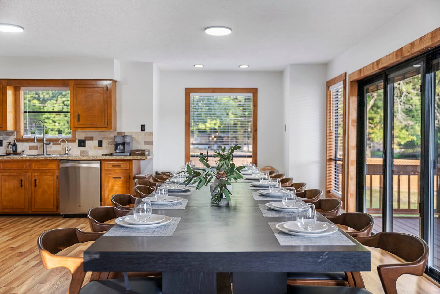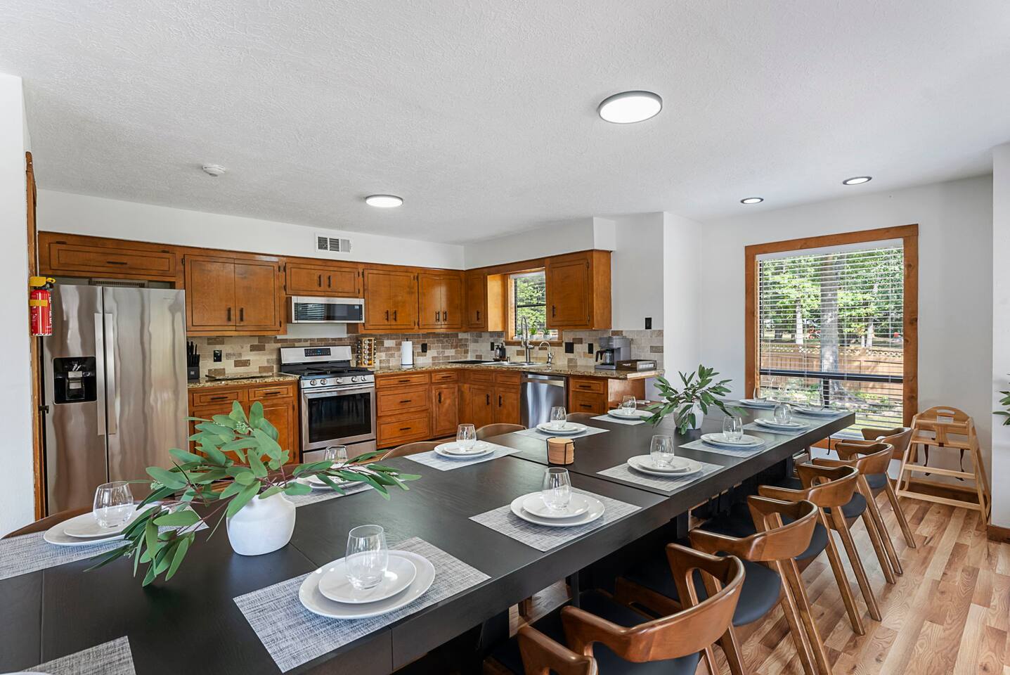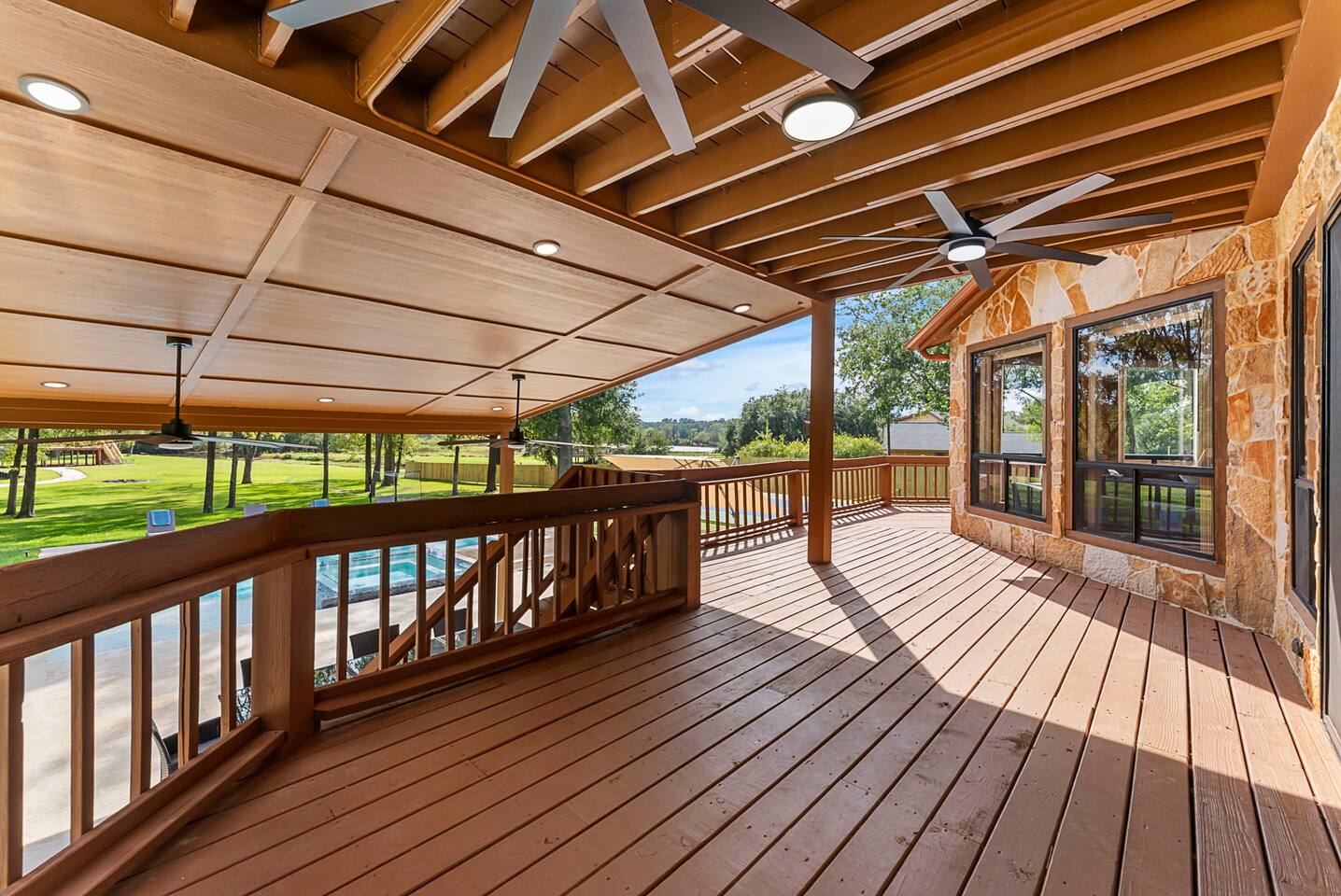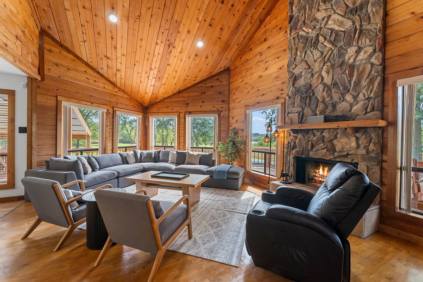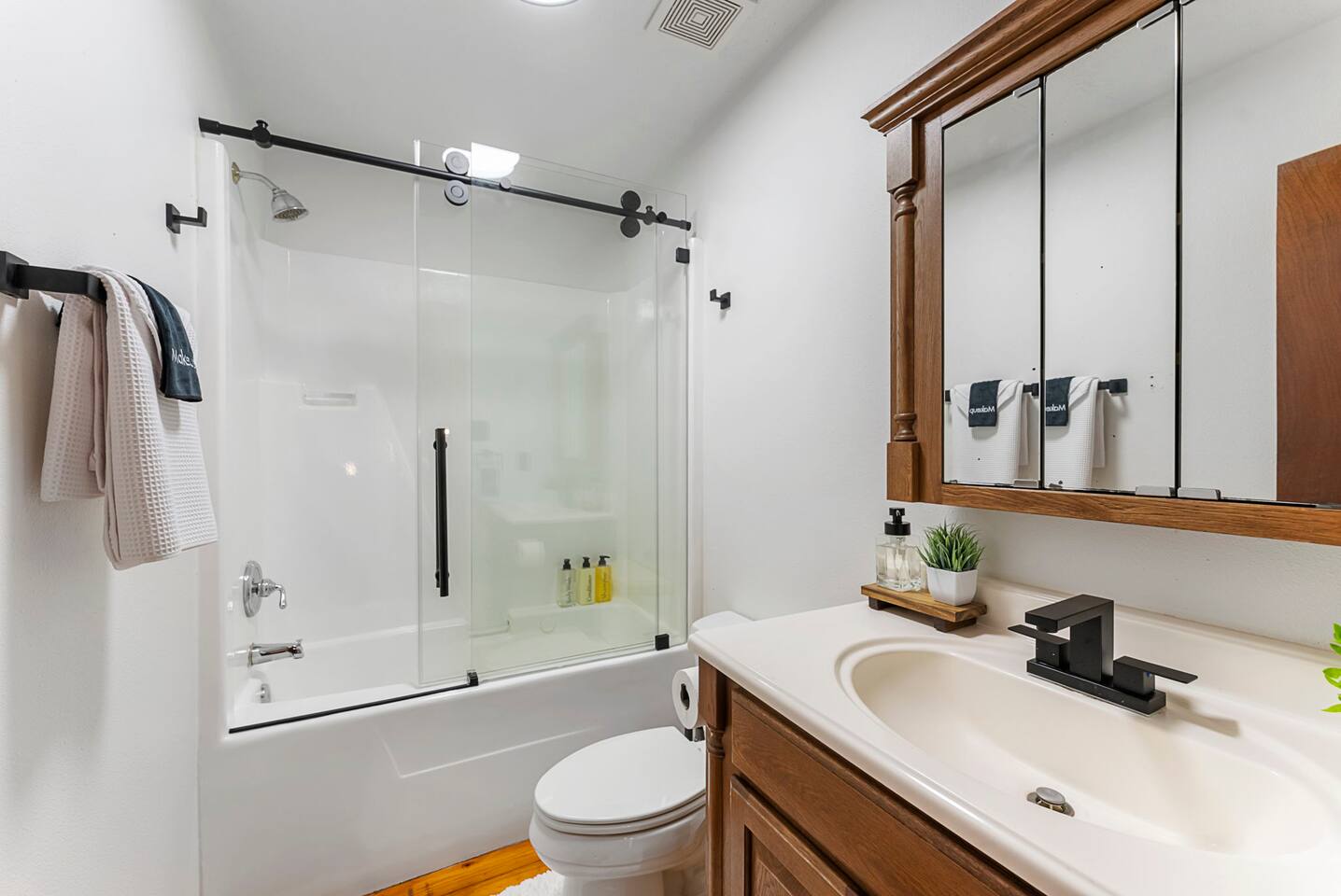 LIST OF AMENITIES - giant sparkling pool/spa - private pickleball court/multi-sport court - 4 hole mini-golf - 2 soccer nets - enclosed trampoline - kids playground - paddleboards (x2) - Gameroom: air hockey, billiards, ping-pong, game table, basketball game, bar area, media couch + big screen TV, and more! - Smart TV's throughout - inside separate gaming area adjacent to main living room in main house with play-station ...AND SO MUCH MORE! SLEEPING • MAIN HOUSE - 1st floor bedrooms: bunk room (2 FULL beds – 4 total people) full bathroom next to bedroom - 2nd floor bedroom: queen bed (elevator accessible), full bathroom next to bedroom - 3rd floor bedroom: King bed, primary suite (requires stairs to access), ensuite bathroom • 2ND HOME - 2nd floor bedroom: Queen bed - 2nd floor bedroom: bunk beds (4 twin beds), Full bathroom in main living area available - Blow up queen mattress in living room SPACES This modernized cabin-style home is really two homes on one property. The main house has 3 bedrooms (bunkroom-no stairs required, queen bedroom- 2nd floor, and primary King bedroom-3rd floor) with full kitchen, living room, 2nd living room, and 3 full bathrooms. The 2nd home is 25 feet from main house and has the converted 3 car RV garage game room with upstairs 2nd-level kitchen, living room, 2 bedrooms (bunk room with 2 bunk-beds and queen bedroom) with one full bathroom. Each house has plenty of deck-space with views of the lake. Both homes do have several stairs to reach bedrooms and main living spaces are on 2nd floors. There is plenty of space to park several cars (10 very comfortably). *IMPORTANT* LAKE ACCESS: a boat rental service company can be arranged after the booking however they will not deliver to the home itself. The drop off/pickup for the boat rental will be arranged offsite. If you have a boat, you are welcome to bring it and there is a public boat ramp about 5 min away to access the lake. Please note that the waters can be shallow around the property and it may be difficult to access with your boat. We do have 2 covered boat slips on-site if desired. There are some hazards north of 1097 bridge so please do your research so you understand the risks associated with parking your boat at the property. ELEVATOR: There is an elevator in the main house that can reach the 2nd floor with queen bed. If you have elderly or those that need assistance or require the use of the elevator, please let us know as we will provide a separate key with code to access it. WATER SAFETY: While this home does have some fencing, please note there is NO fencing around the pool or preventing children from falling into the lake so please prepare accordingly. You release the owner and property manager from any liability for the use of the property and understand water risks of being lakefront and with a pool.