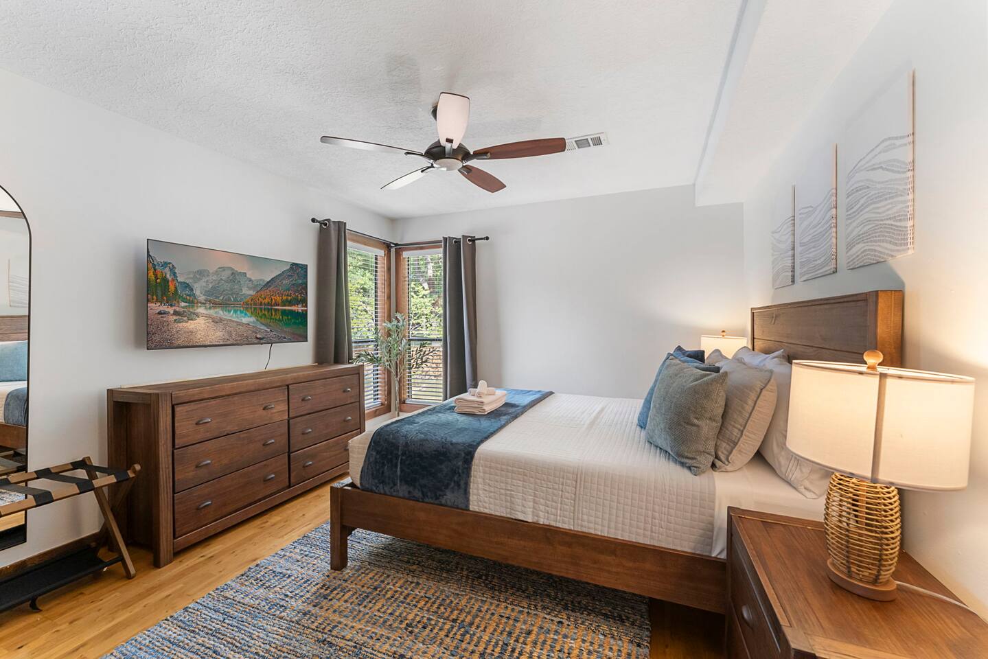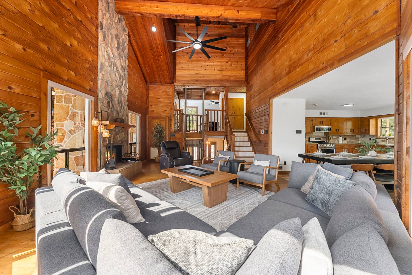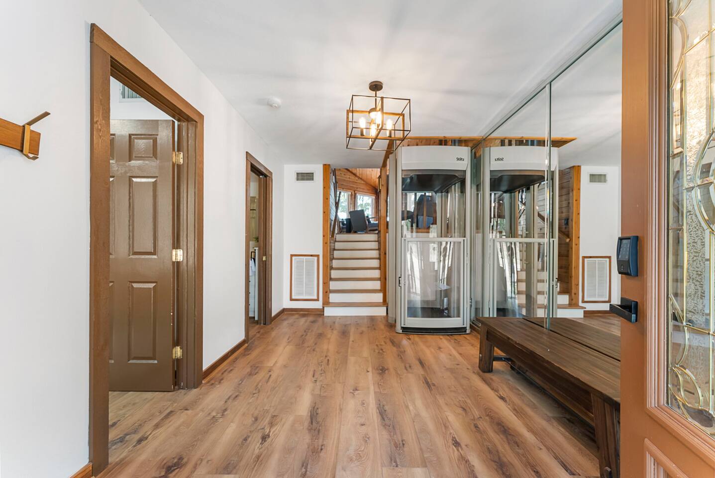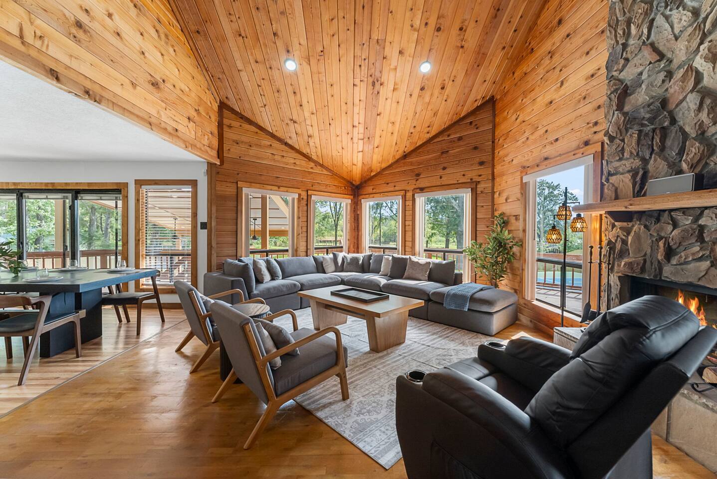 LIST OF AMENITIES - giant sparkling pool/spa - private pickleball court/multi-sport court - 4 hole mini-golf - 2 soccer nets - enclosed trampoline - kids playground - paddleboards (x2) - Gameroom: air hockey, billiards, ping-pong, game table, basketball game, bar area, media couch + big screen TV, and more! - Smart TV's throughout - inside separate gaming area adjacent to main living room in main house with play-station ...AND SO MUCH MORE! SLEEPING • MAIN HOUSE - 1st floor bedrooms: bunk room (2 FULL beds – 4 total people) full bathroom next to bedroom - 2nd floor bedroom: queen bed (elevator accessible), full bathroom next to bedroom - 3rd floor bedroom: King bed, primary suite (requires stairs to access), ensuite bathroom • 2ND HOME - 2nd floor bedroom: Queen bed - 2nd floor bedroom: bunk beds (4 twin beds), Full bathroom in main living area available - Blow up queen mattress in living room SPACES This modernized cabin-style home is really two homes on one property. The main house has 3 bedrooms (bunkroom-no stairs required, queen bedroom- 2nd floor, and primary King bedroom-3rd floor) with full kitchen, living room, 2nd living room, and 3 full bathrooms. The 2nd home is 25 feet from main house and has the converted 3 car RV garage game room with upstairs 2nd-level kitchen, living room, 2 bedrooms (bunk room with 2 bunk-beds and queen bedroom) with one full bathroom. Each house has plenty of deck-space with views of the lake. Both homes do have several stairs to reach bedrooms and main living spaces are on 2nd floors. There is plenty of space to park several cars (10 very comfortably). *IMPORTANT* LAKE ACCESS: a boat rental service company can be arranged after the booking however they will not deliver to the home itself. The drop off/pickup for the boat rental will be arranged offsite. If you have a boat, you are welcome to bring it and there is a public boat ramp about 5 min away to access the lake. Please note that the waters can be shallow around the property and it may be difficult to access with your boat. We do have 2 covered boat slips on-site if desired. There are some hazards north of 1097 bridge so please do your research so you understand the risks associated with parking your boat at the property. ELEVATOR: There is an elevator in the main house that can reach the 2nd floor with queen bed. If you have elderly or those that need assistance or require the use of the elevator, please let us know as we will provide a separate key with code to access it. WATER SAFETY: While this home does have some fencing, please note there is NO fencing around the pool or preventing children from falling into the lake so please prepare accordingly. You release the owner and property manager from any liability for the use of the property and understand water risks of being lakefront and with a pool.