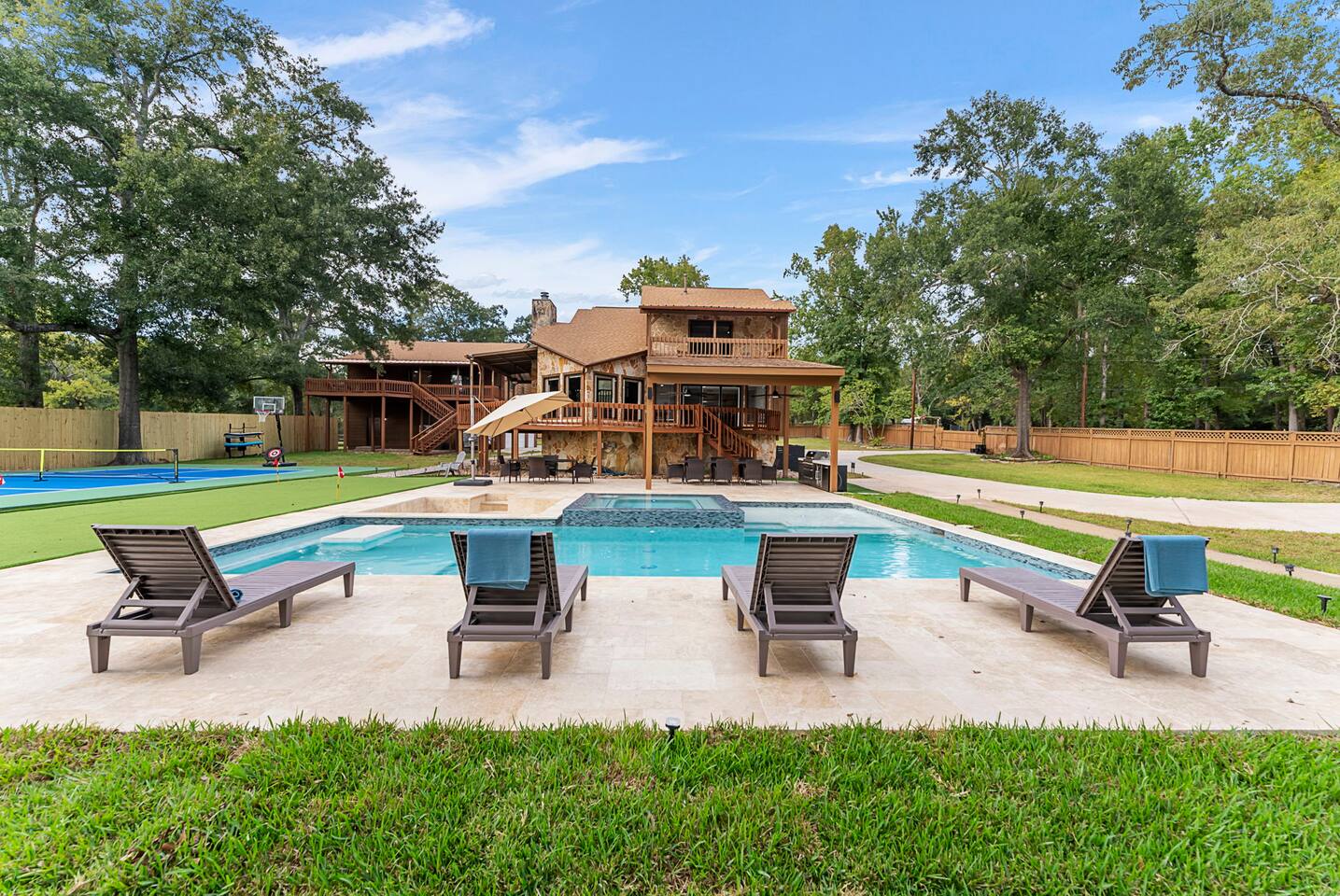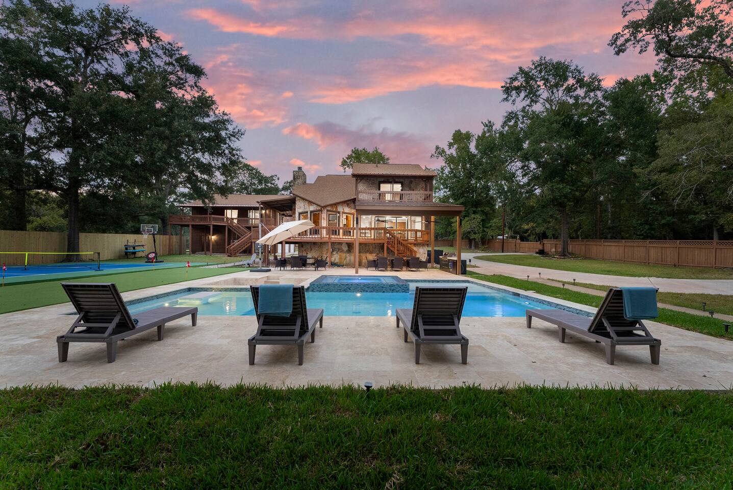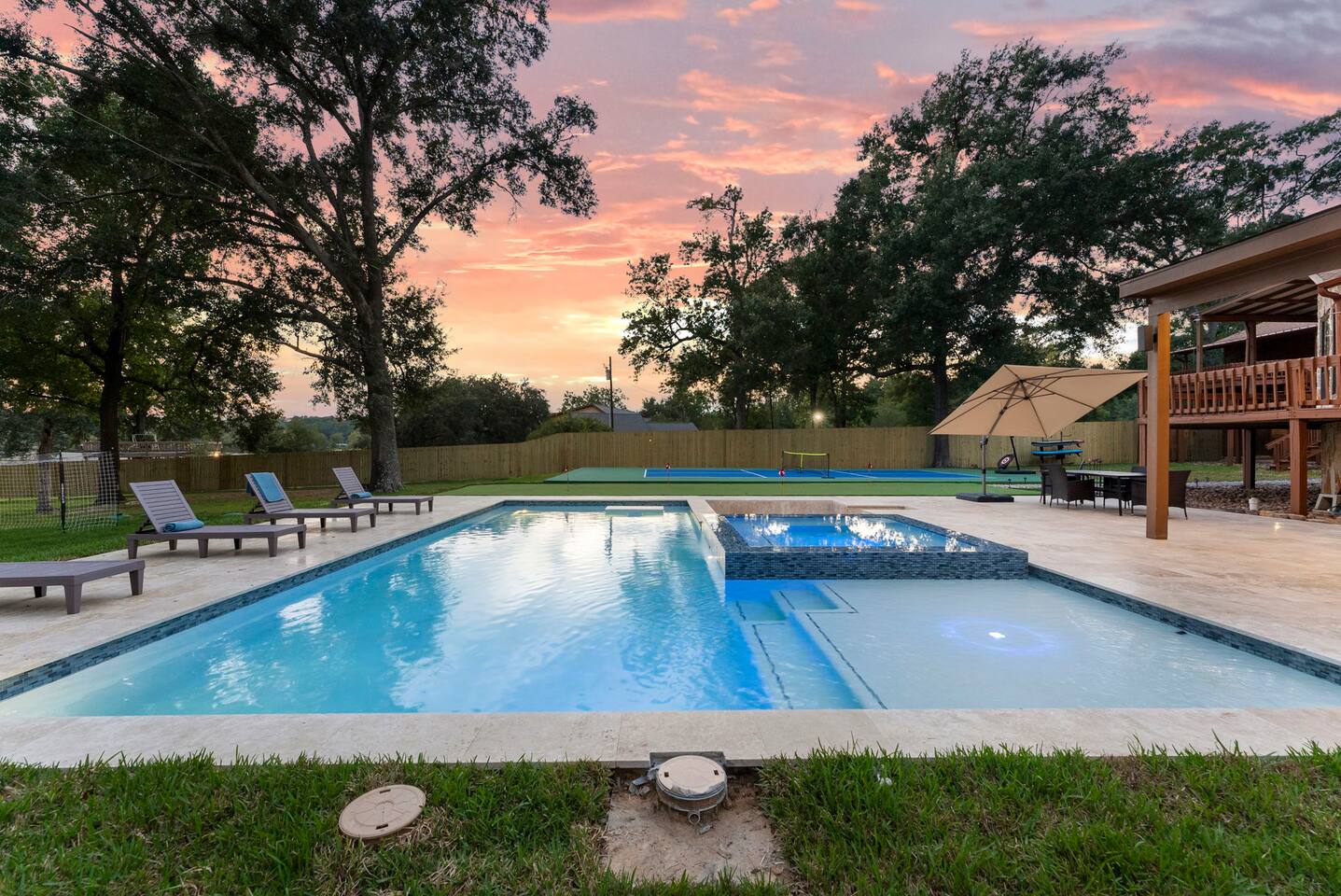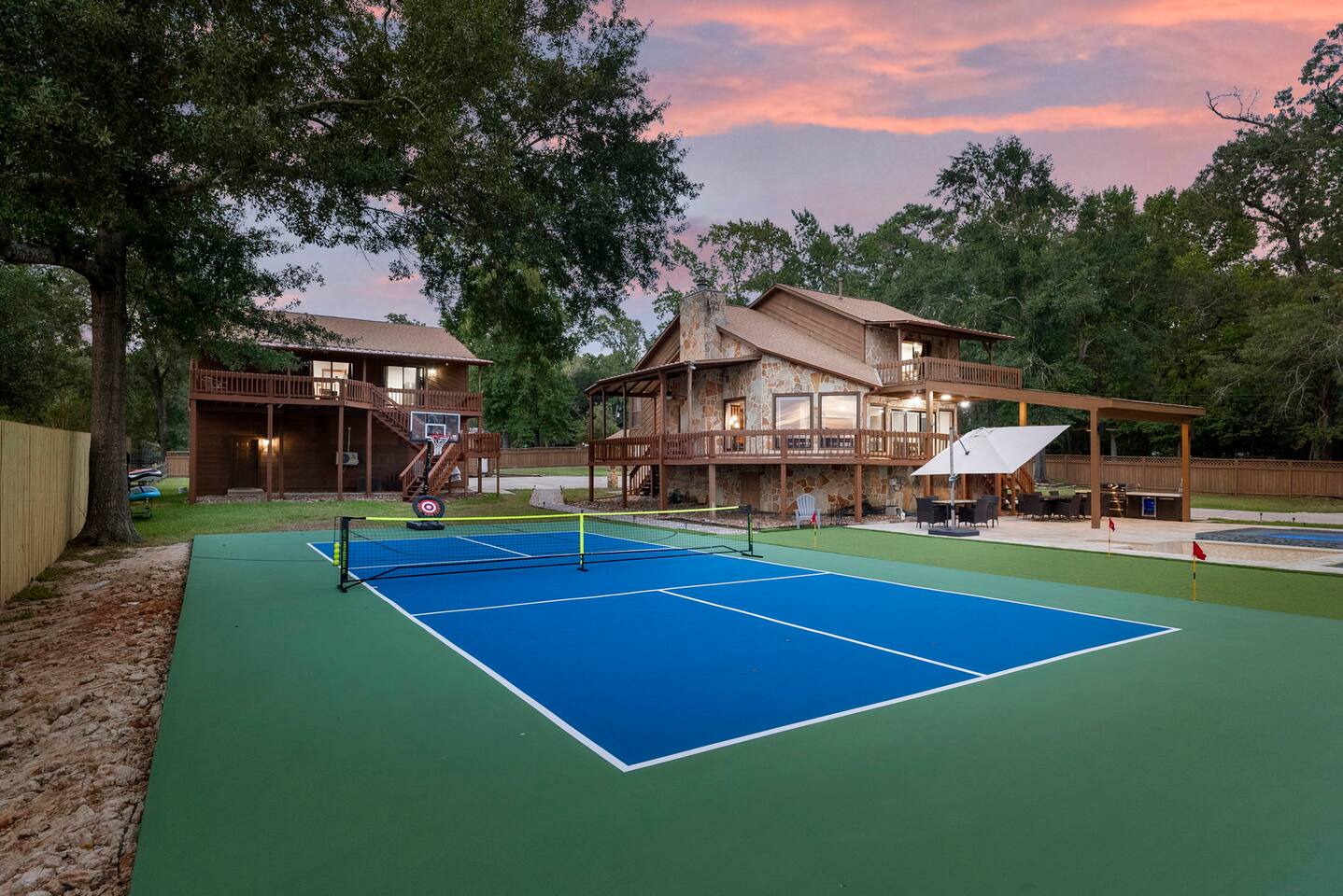 Down country roads on the north shores of Lake Conroe in Willis, TX you will find our country modern oasis "Infinity Oaks", the ULTIMATE family-fun retreat on 2+ acres! Swim in the sparkling new custom pool/spa, enjoy the sunken fire-pit with s'mores, play air hockey/ping pong/billiards in the custom game-room with bar & big-screen TV, or go on the paddleboards & kayaks on Lake Conroe! Literally the fun will never end here with the additional private pickleball/multi-sport court, games, & more!