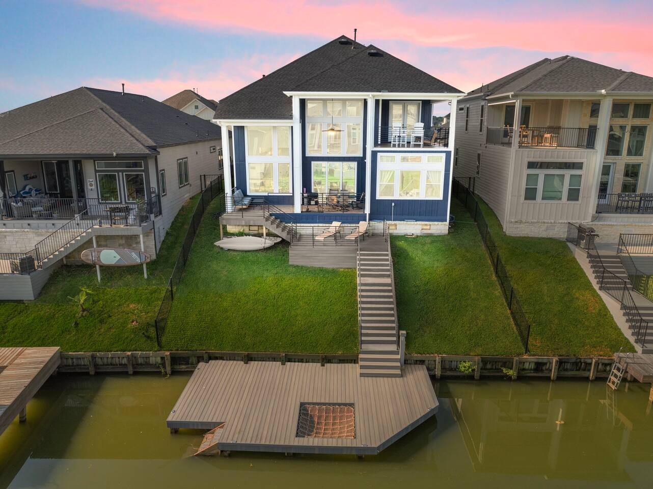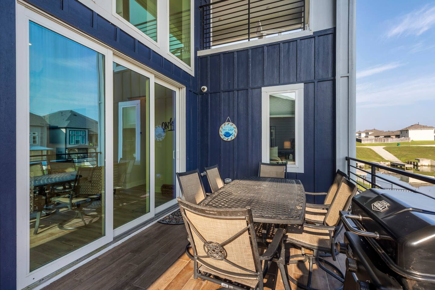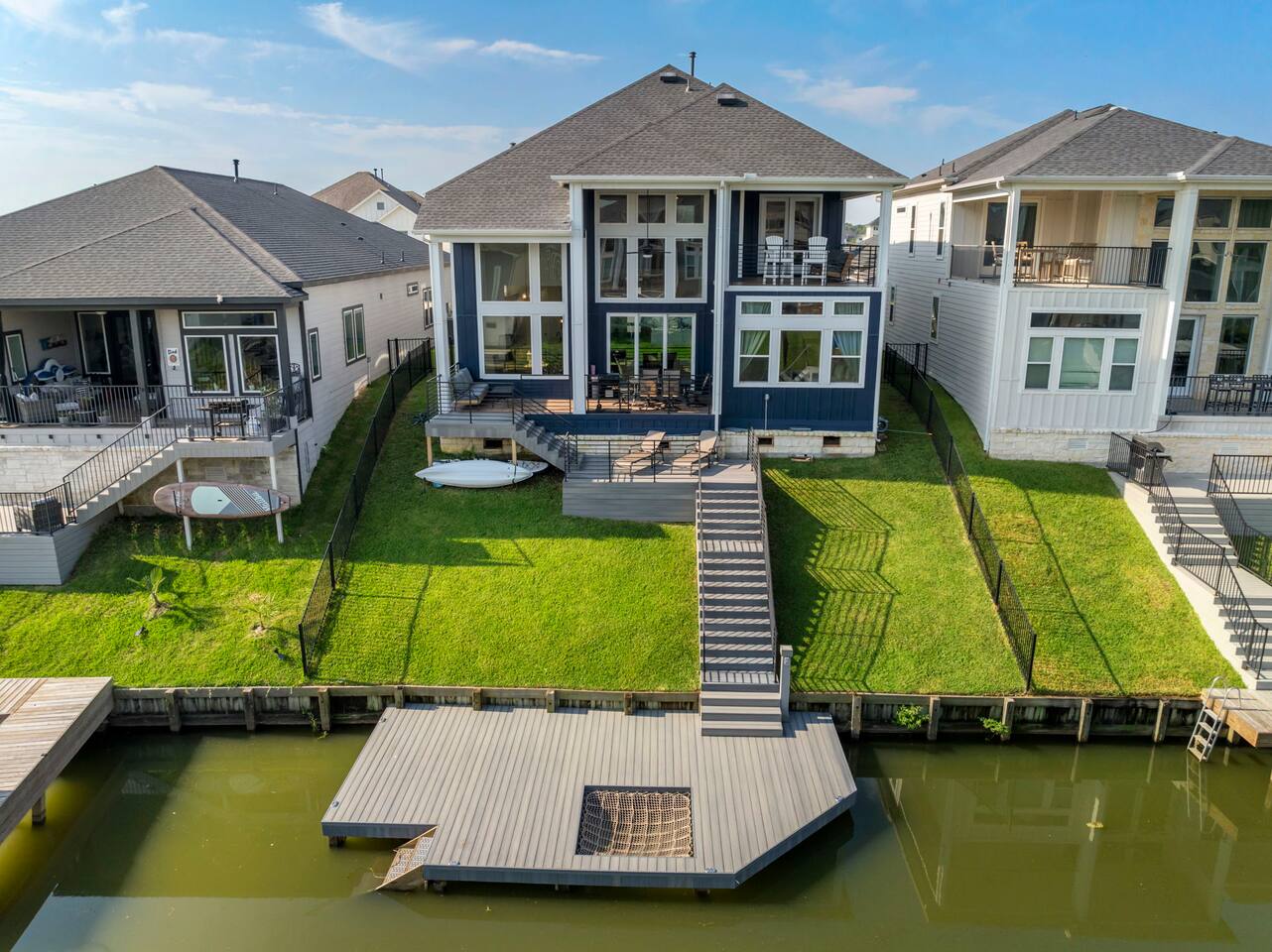 Downstairs sleeping: 1. King bedroom w full bath 2. Full over full bunk bedroom w full bath 3. Fold out full size futon in media room Upstairs sleeping: 1. Queen bedroom w full bath 2. Full over full bunk bedroom Downstairs media room is set up for gaming or movies. Enjoy the PlayStation or bring your own gaming device. Don't forget your movie streaming app log ins to connect to the smart tv! Enjoy the popcorn machine to enhance your movie experience! Downstairs deck includes an outdoor dining table for 6, propane grill, lounge chairs for soaking up the Sun, and a paddle board and kayak! Upstairs game room has a foosball table, darts, and bar table for playing board games or cards. Upstairs balcony is perfect for sipping your morning coffee and watching the sunrise. Play a game of corn hole while you enjoy the breeze! Our cozy little canal has a boat ramp and fishing piers for you to enjoy.