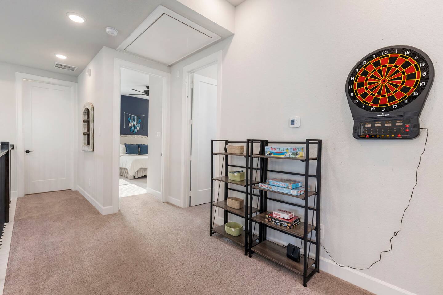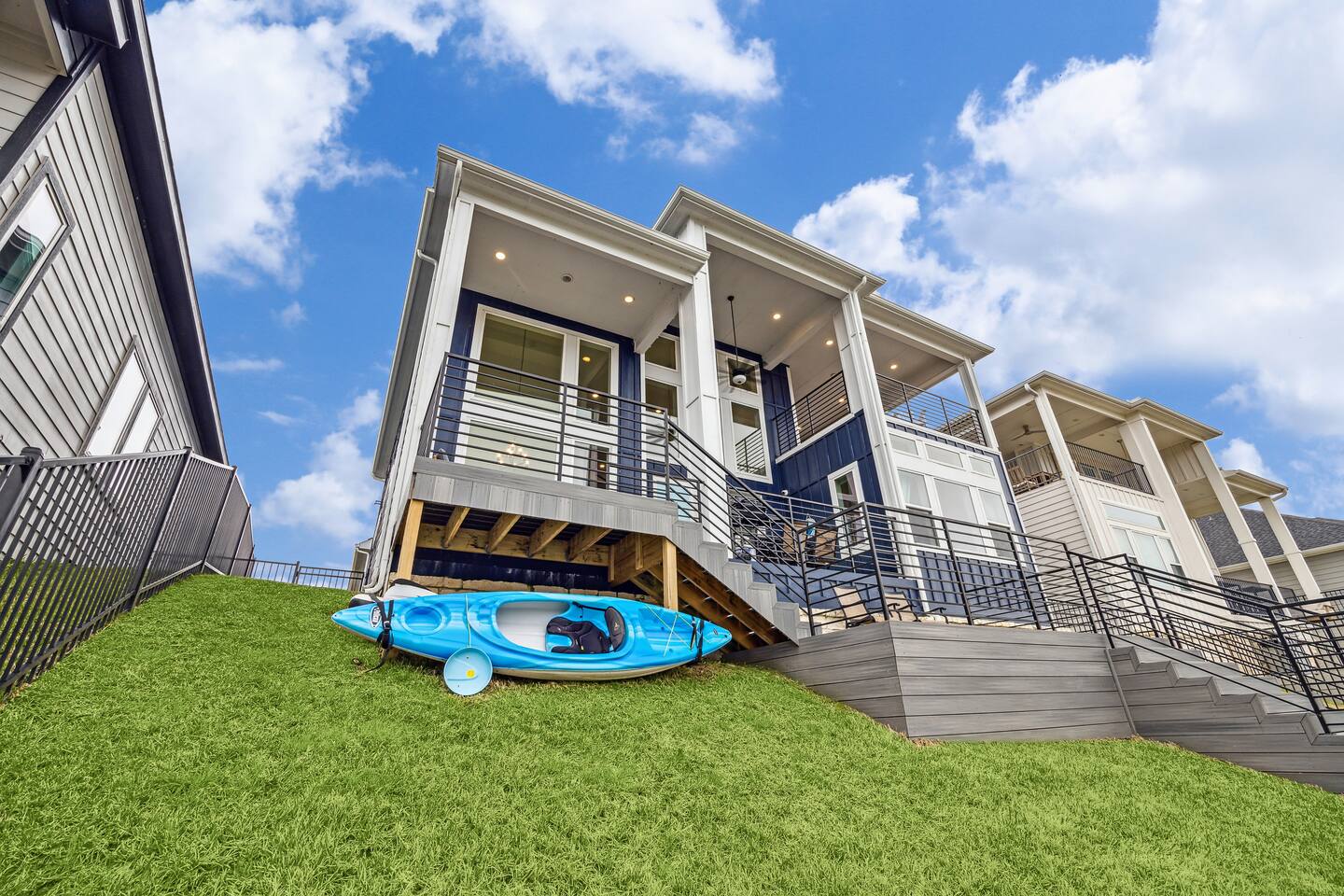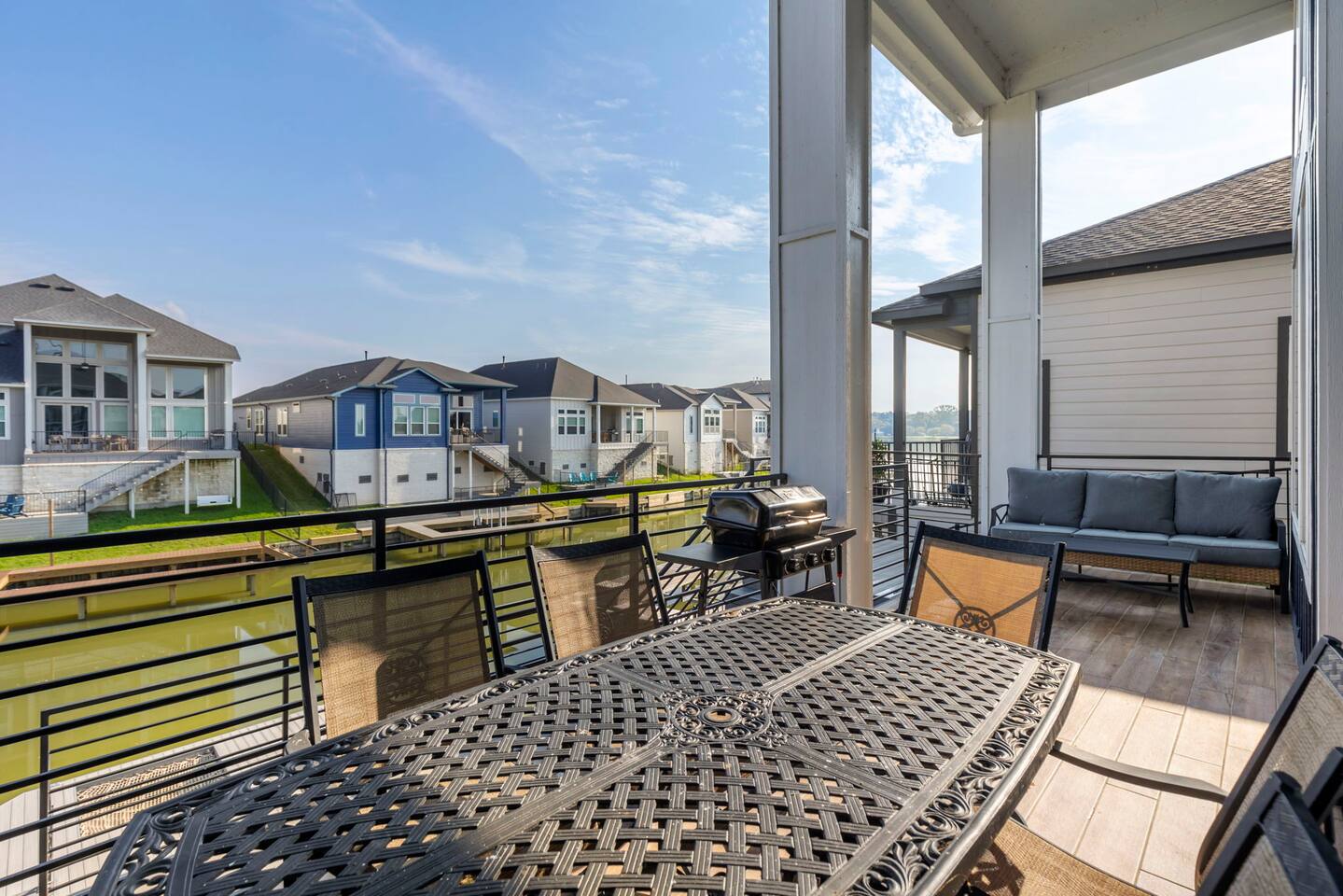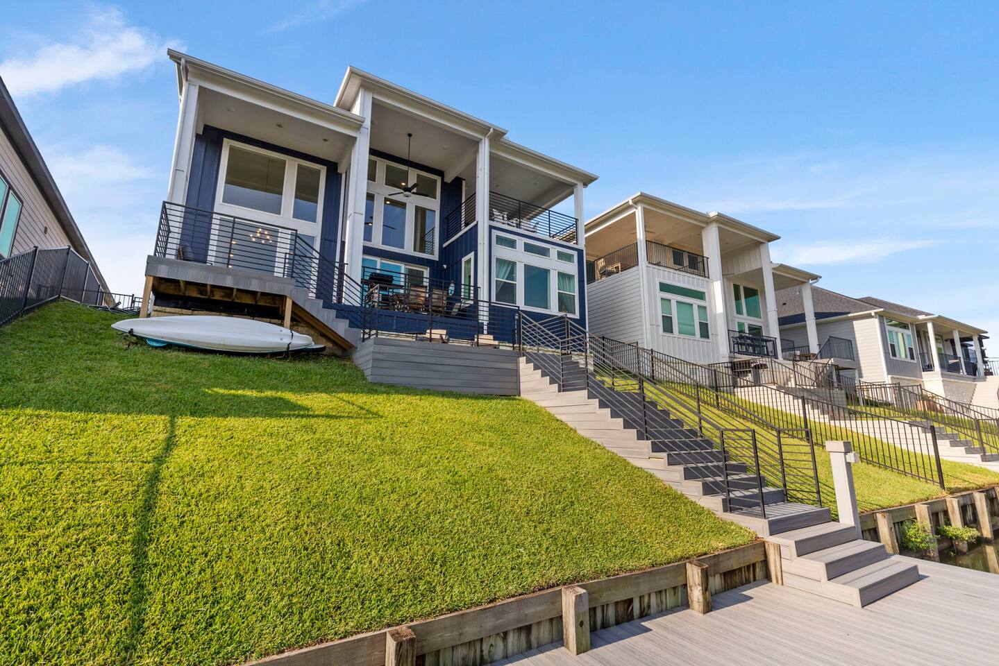 Downstairs sleeping: 1. King bedroom w full bath 2. Full over full bunk bedroom w full bath 3. Fold out full size futon in media room Upstairs sleeping: 1. Queen bedroom w full bath 2. Full over full bunk bedroom Downstairs media room is set up for gaming or movies. Enjoy the PlayStation or bring your own gaming device. Don't forget your movie streaming app log ins to connect to the smart tv! Enjoy the popcorn machine to enhance your movie experience! Downstairs deck includes an outdoor dining table for 6, propane grill, lounge chairs for soaking up the Sun, and a paddle board and kayak! Upstairs game room has a foosball table, darts, and bar table for playing board games or cards. Upstairs balcony is perfect for sipping your morning coffee and watching the sunrise. Play a game of corn hole while you enjoy the breeze! Our cozy little canal has a boat ramp and fishing piers for you to enjoy.
